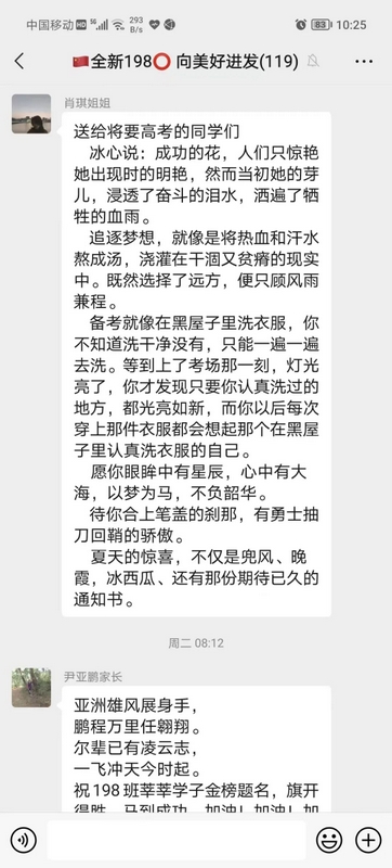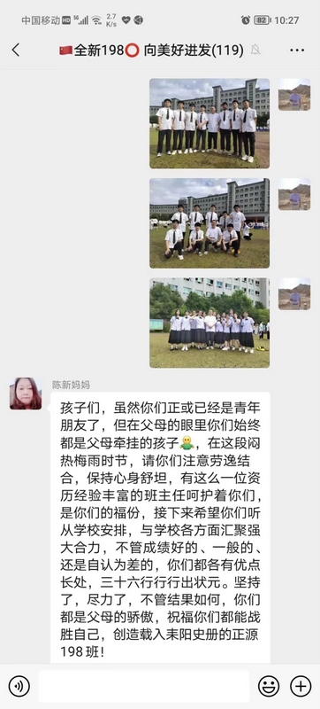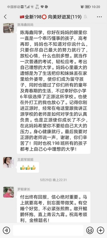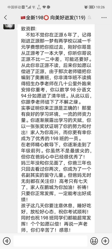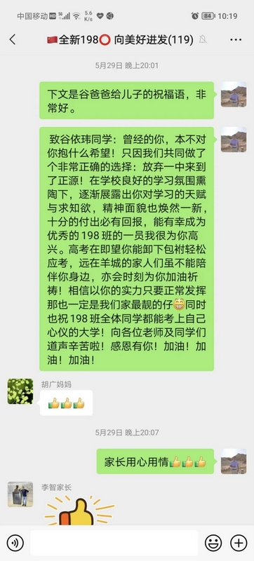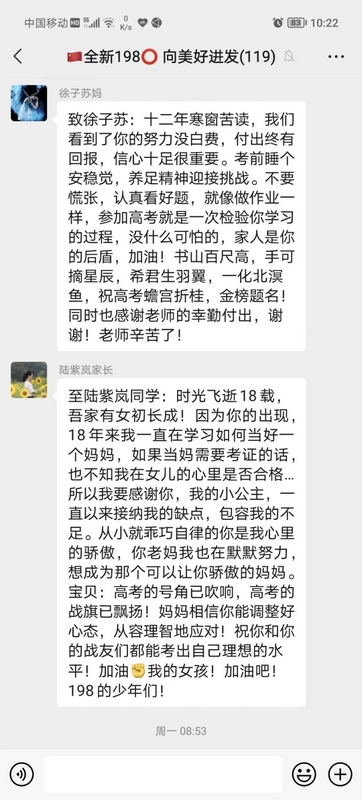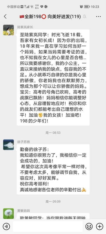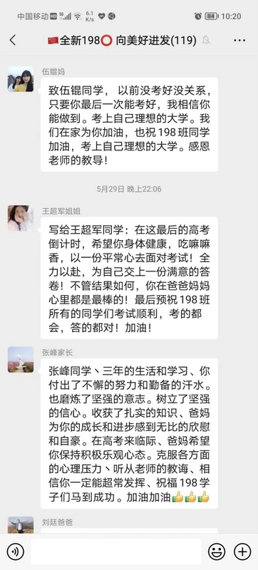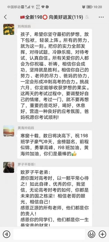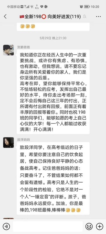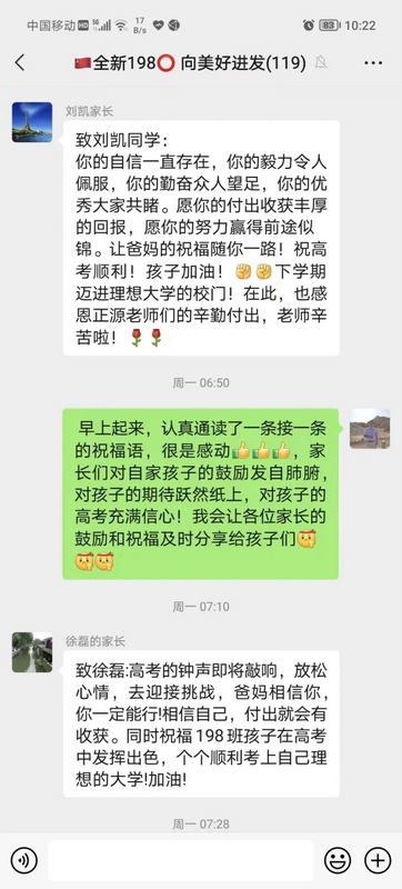 家长们也特别信任,特别配合,尤其是本届家长,有了之前的成功案例和老师的耐心引导,不仅配合学校安排不来送考“添乱”,不给学生打电话“添堵”,还在班级群里给孩子们留言鼓励,送上祝福。班主任老师选取了部分家长的知心留言,在读报时间跟同学们分享,传达家长的美好祝愿,缓解孩子们的紧张心情, 效果很好。