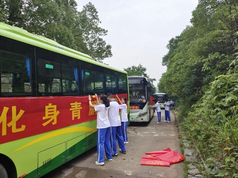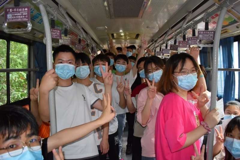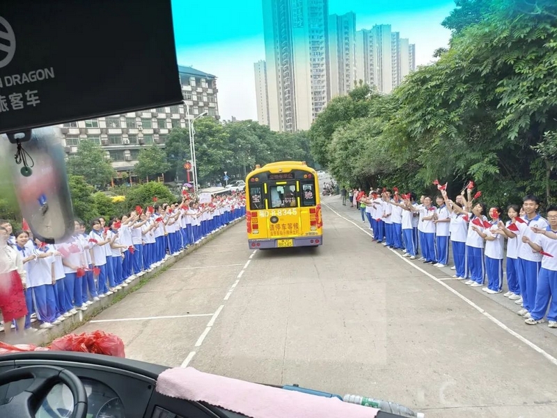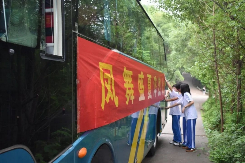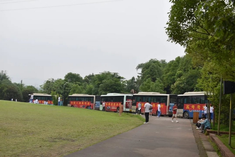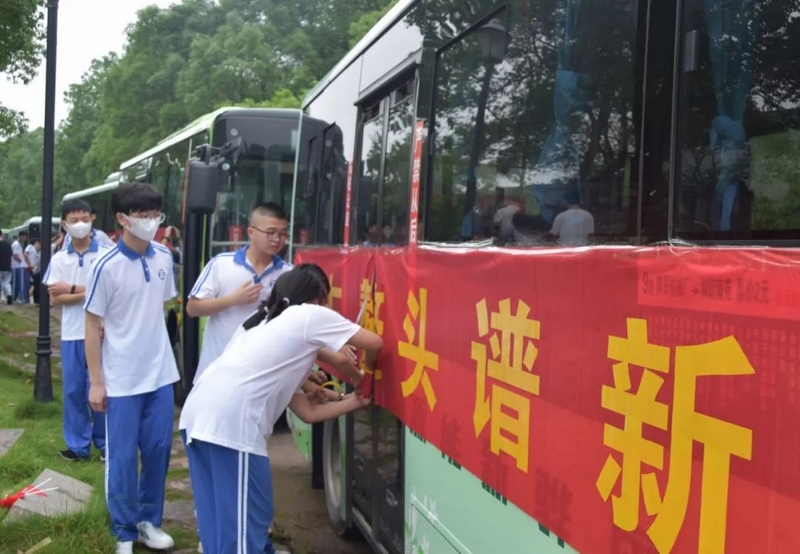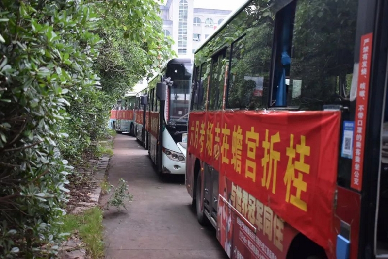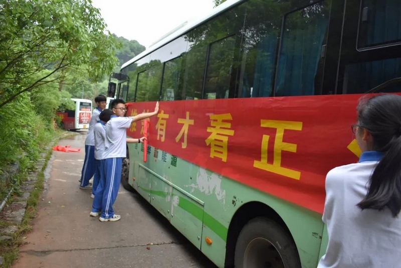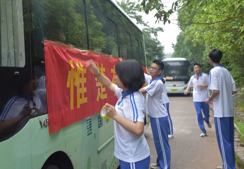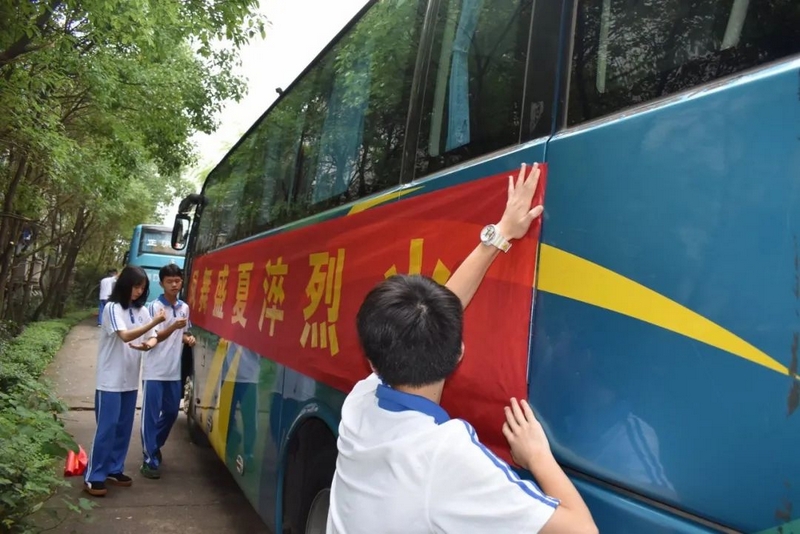 52台大巴顺着东苑西苑两座山麓蜿蜒逶迤,沿着环校路次第排开,早早起来的高二学弟学妹们已将车身两侧贴满高考祝福标语。