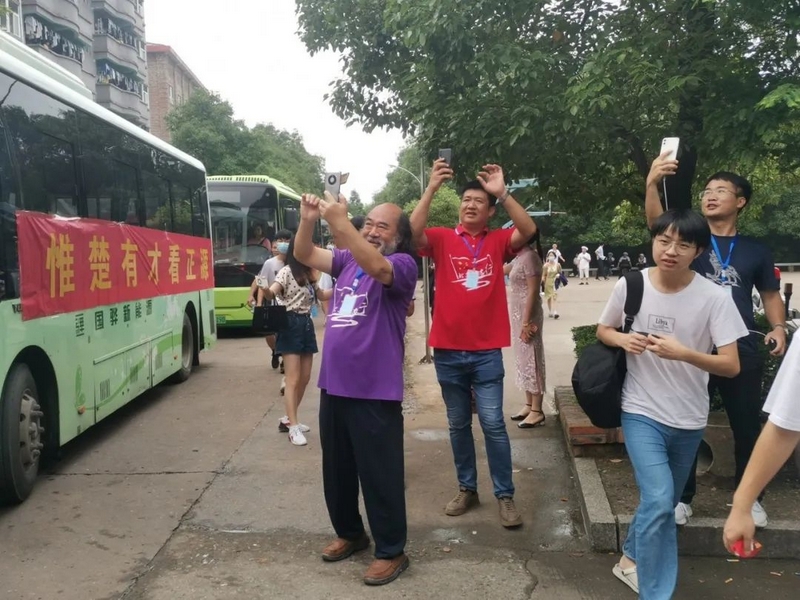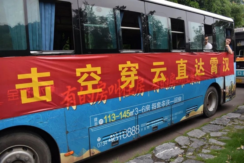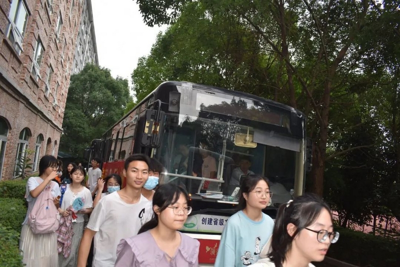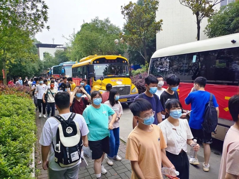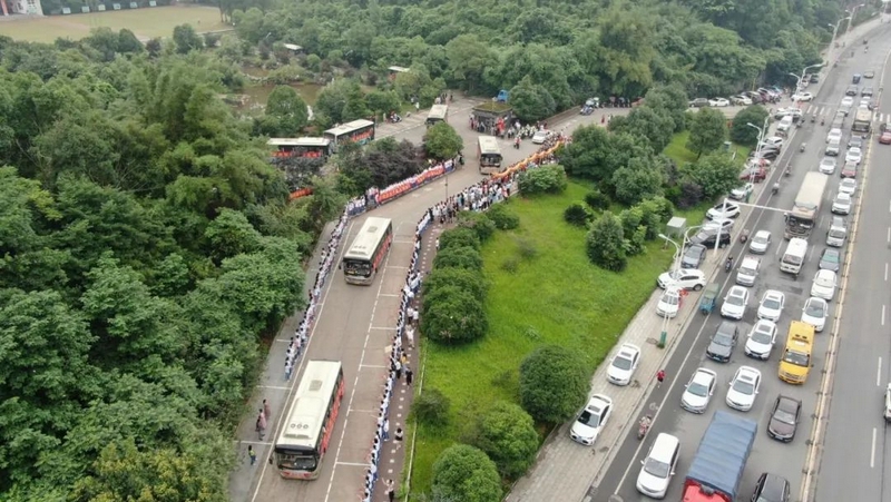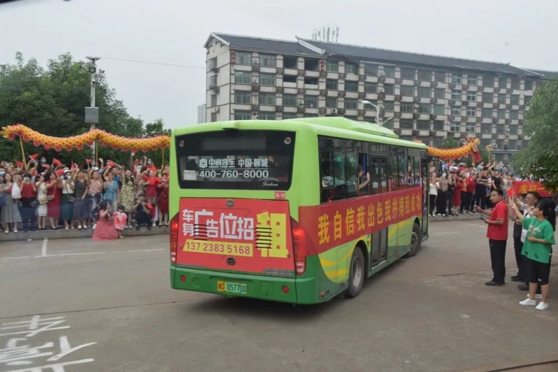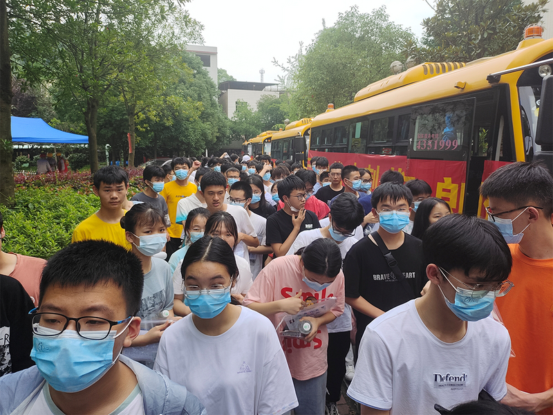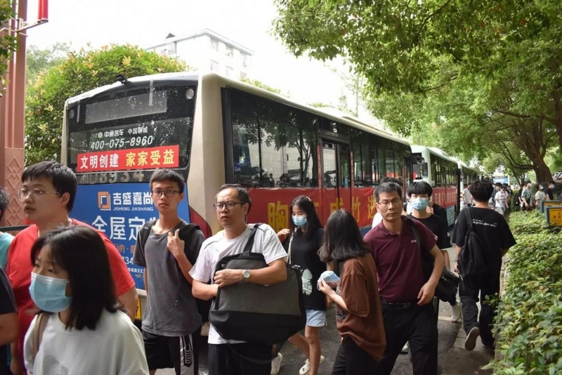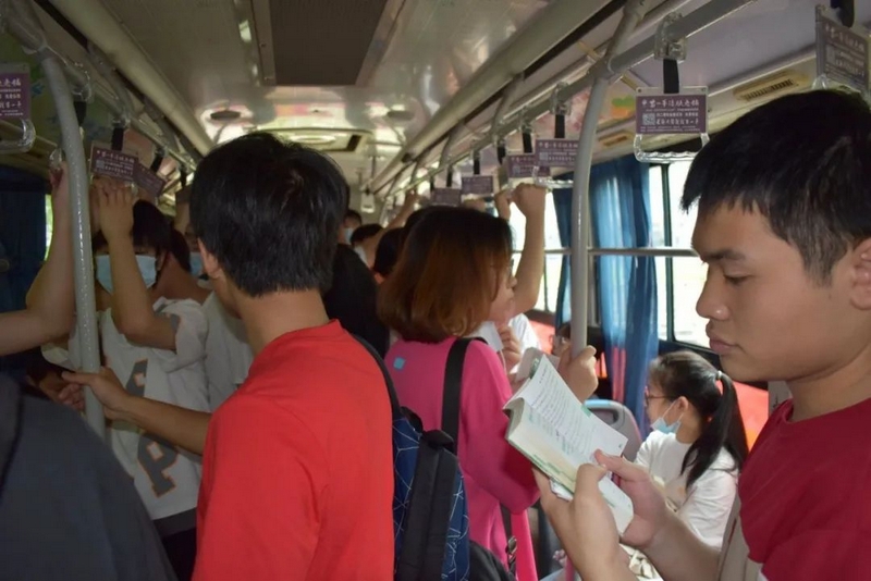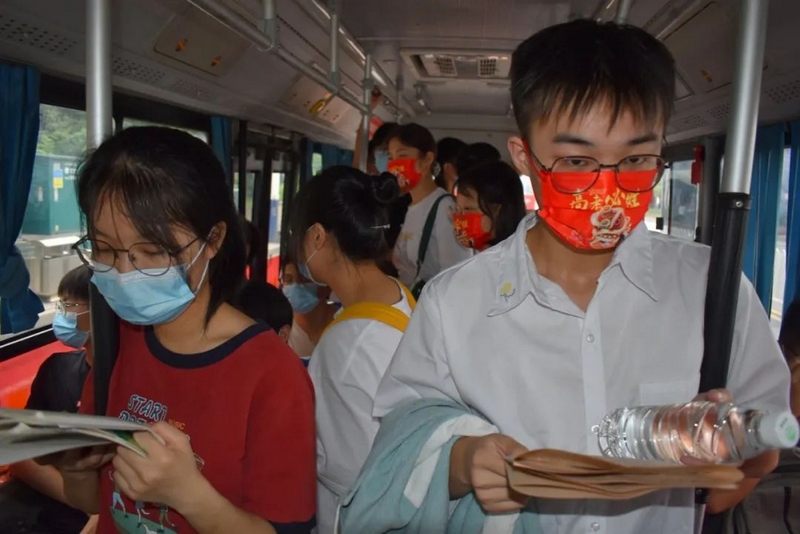 52台大巴顺着东苑西苑两座山麓蜿蜒逶迤,沿着环校路次第排开,早早起来的高二学弟学妹们已将车身两侧贴满高考祝福标语。
