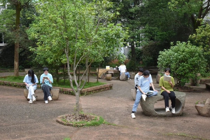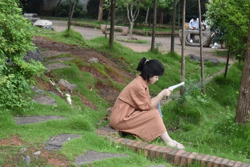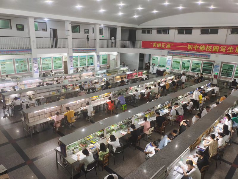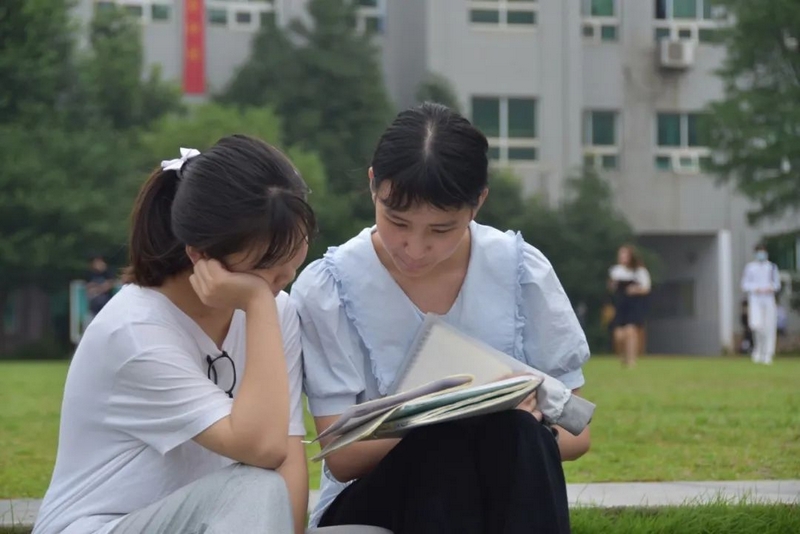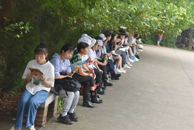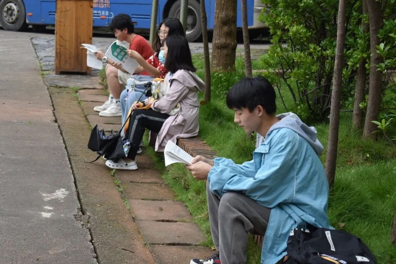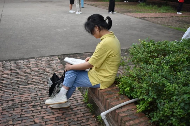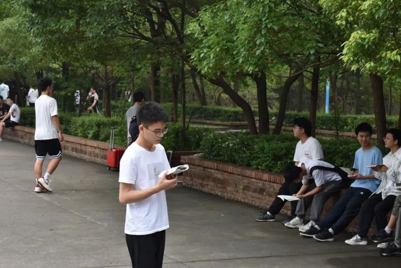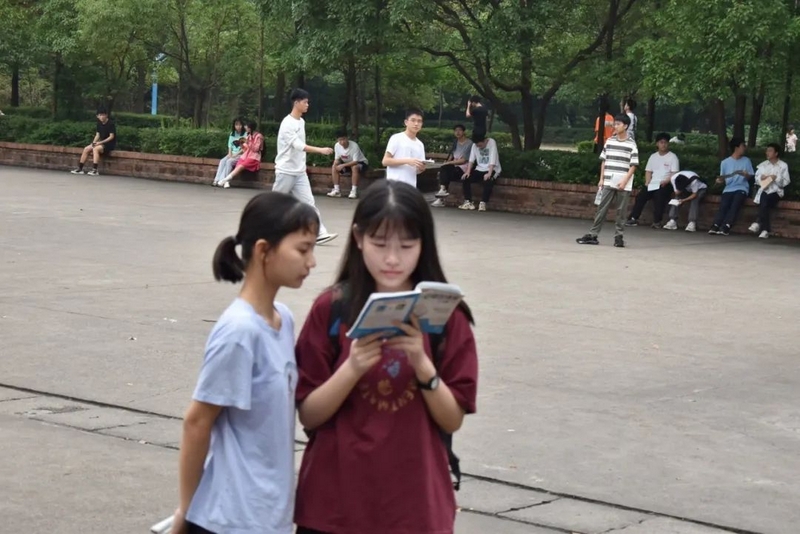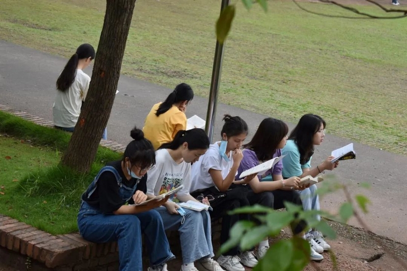 微风在树梢徐徐轻拂,鸟雀在枝头欢快鸣叫。高三考生吃过早餐,陆续由北向南漫步到正源广场。石阶上、绿荫下、草坪中、池塘旁……早到的同学已经轻展书卷,迎着朝阳临阵磨枪。