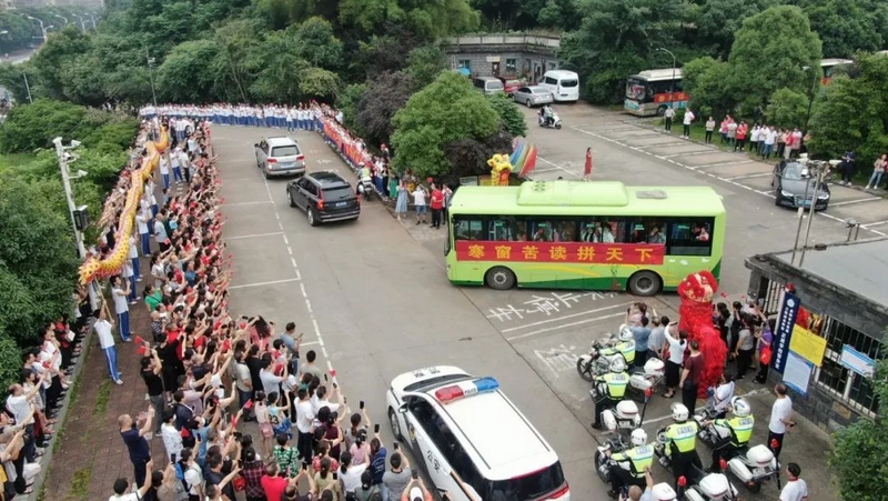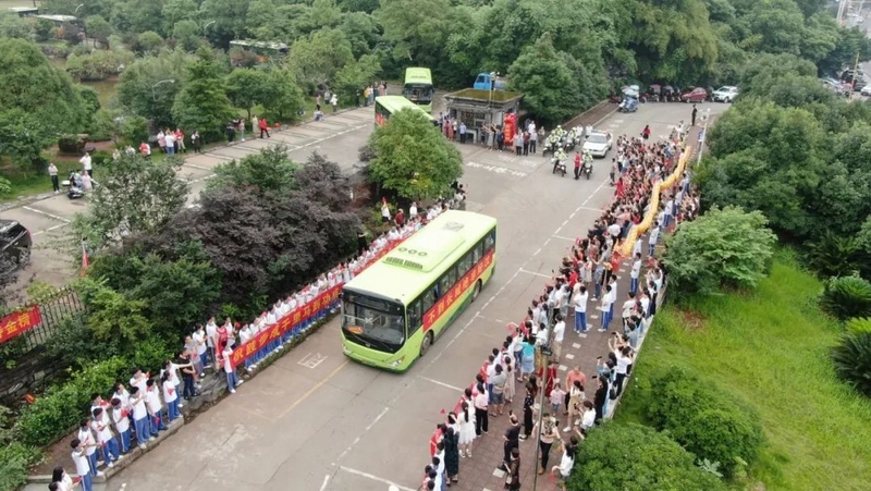 校长率队、交警开道,一路畅通无阻抵达考点。下车,进场,分发证件,拍肩击掌,送考入场从容不迫,有条不紊。