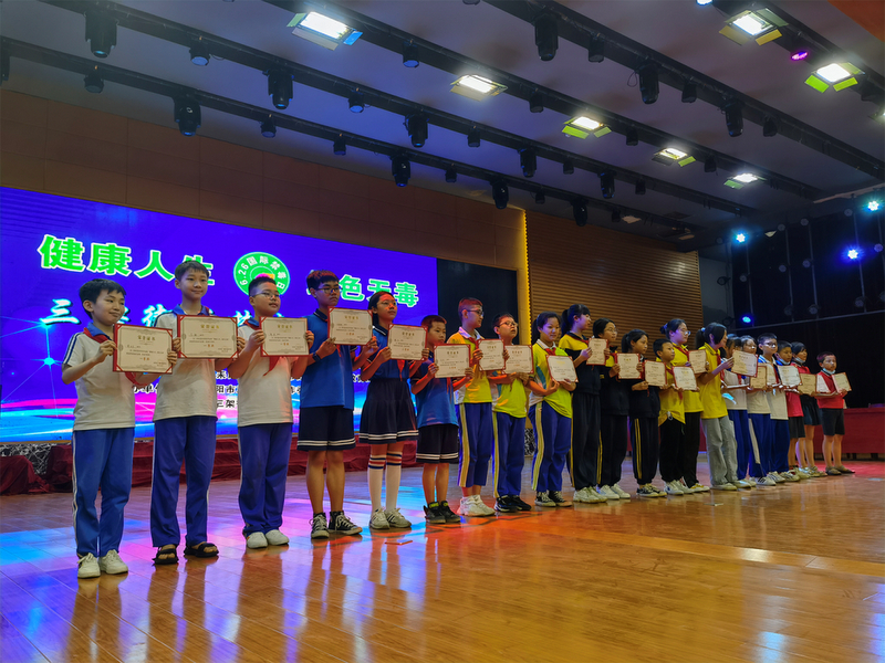 2022年6月22日上午,由学部主任罗俊豪、罗林珂老师、五年级年级主任蒋飞以及五年级教务主任吕玲玉四位老师带领参赛队伍在师大附中耒阳分校进行比赛。比赛采用必答题、抢答题、附加题三种形式,限定答题时间进行答题,抢答或答错都将扣分。现场气氛十分活跃,正源学校代表队3位同学沉着冷静,分工明确,自信满满。学生们根据自己对毒品知识的了解,积极答题,表现优异,一举夺得了耒阳市首届校园禁毒知识竞赛的第一名。全场欢声雷动,为优秀的正源学子喝彩。赛后几位同学忍不住分享胜利的秘诀:“这次比赛我们主要是不紧张,因为学校这样的知识竞赛活动非常多,我们很熟悉这种比赛模式,知识点记得很牢。”比赛结束后,同学们纷纷表示,今后不仅要做一名小小的禁毒知识宣传员,而且还要带动身边的人一起加入到禁毒活动中,让我们的社会更加美好、和谐。