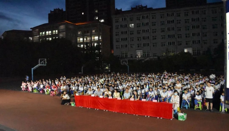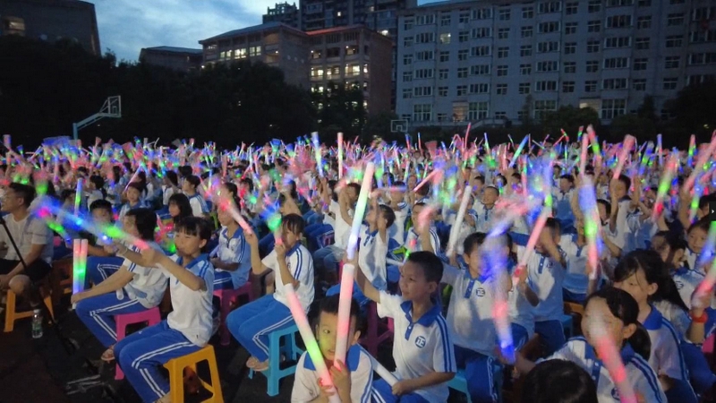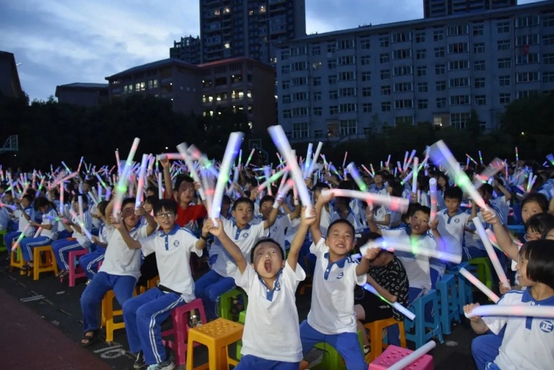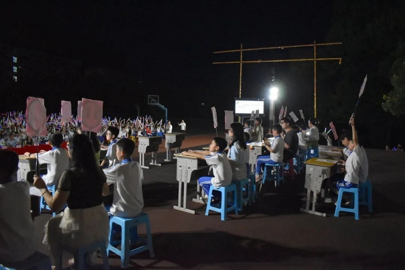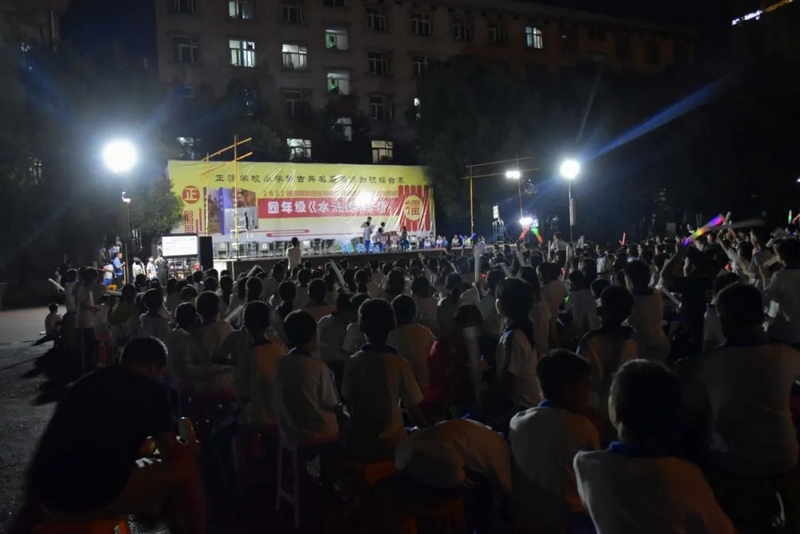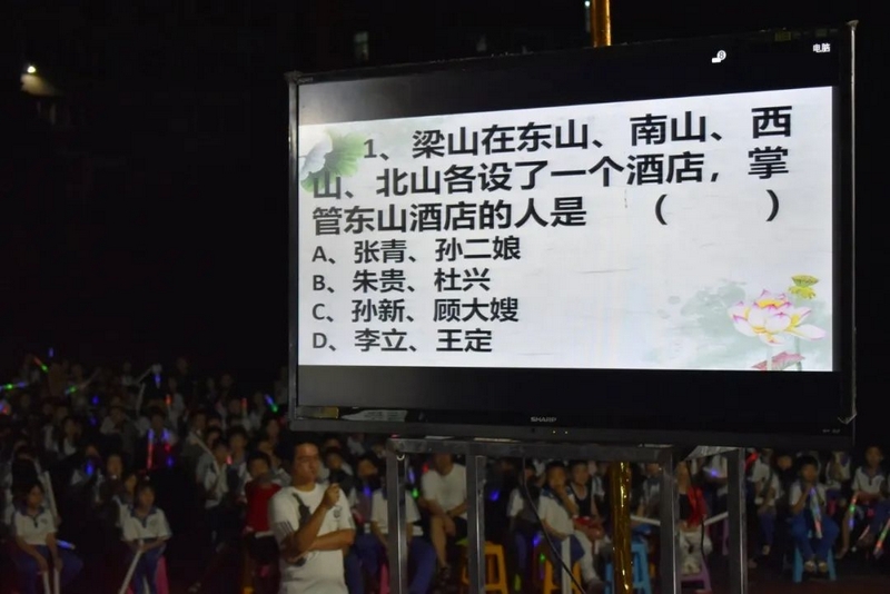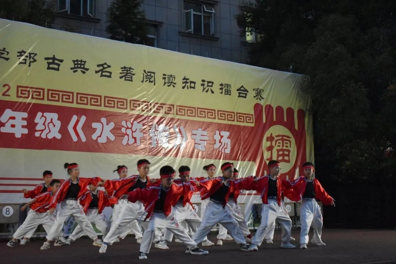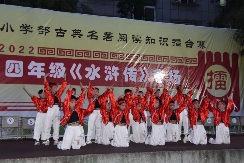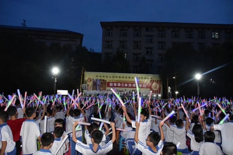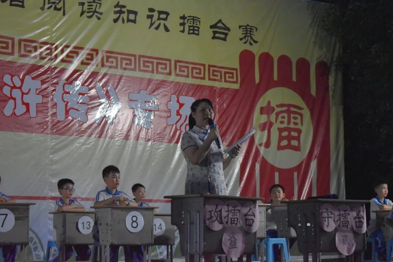 6月23日晚7:30分,正源学校小学部运动场上热火朝天。小学四年级全体师生欣赏着361班带来的开场舞《好汉歌》。主席台上20位天真无邪的小小少年,着红衣白裤,英姿飒爽, 和着铿锵激昂的旋律,跳起了欢快的舞蹈。小可爱们翥凤翔鸾,活力四射,深深吸引了全场观众。舞台下观众一边挥舞着手中的荧光棒,一边欢唱,嘹亮的歌声响彻云霄。运动场成了欢乐的海洋。“年年岁岁花相似,岁岁年年人不同”。这里是一年一度的小学四年级名著阅读《水浒传》擂台赛现场。