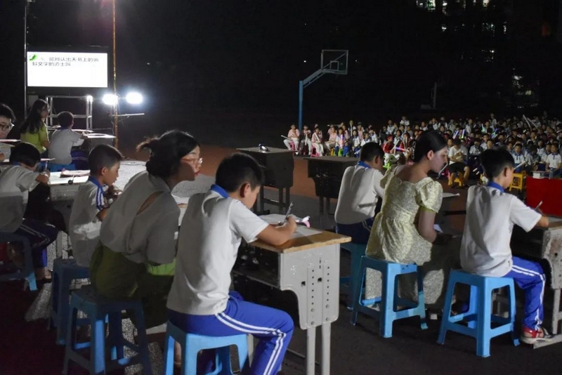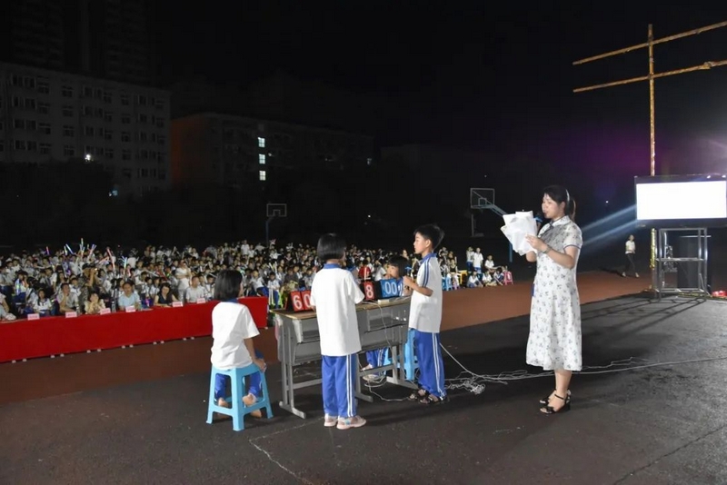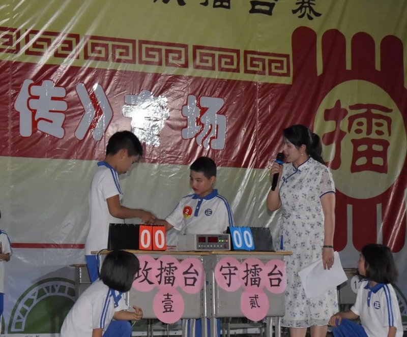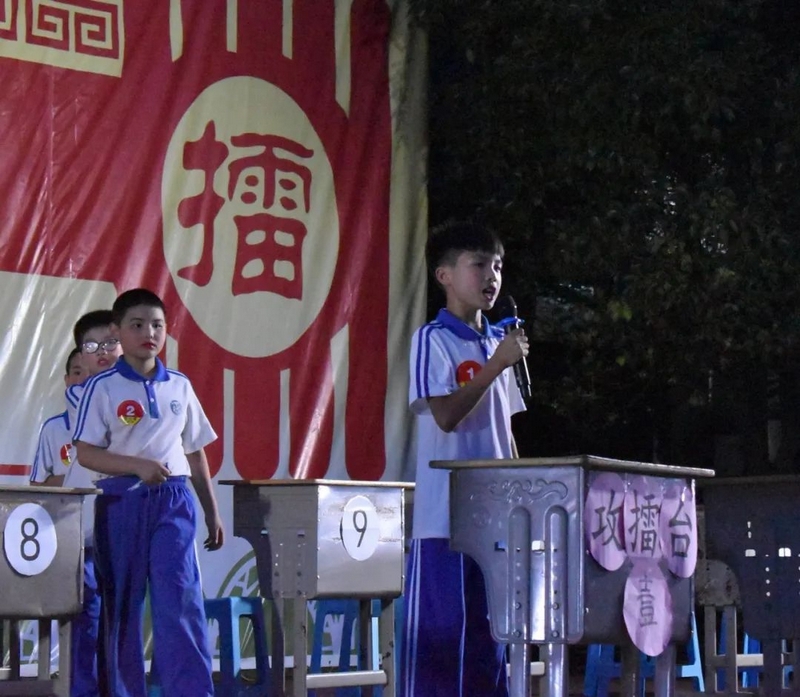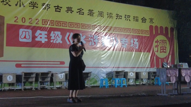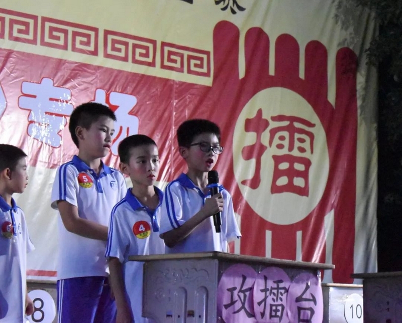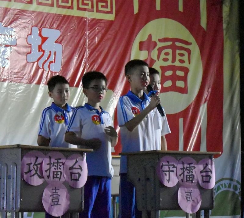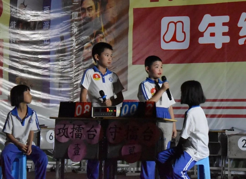 7:40分,年级通过阅读知识竞赛海选后,年级阅读专业老师——刘红老师精心筛选的14名选手,陆续上台作完自我介绍,主持人四年级语文老师陈兰芳宣布擂台赛正式开始。第一环节——选擂赛 。主持人宣读比赛规则后,选手答题。这是擂台赛的前奏,这一环节将诞生五位攻擂手,一起争霸本次擂台赛的擂主。十多分钟后选手答题完毕。在评委老师紧密锣鼓地统分评选的时候,363班同学的舞蹈《一起向未来》,又一次感染了全场师生。场下荧光闪烁,欢歌笑语充满校园!真可谓棋逢对手,将遇良才。选拔进入第二环节——攻擂赛。前五的同学中,来自350班的1号选手张旭同学和来自359班的10号选手曹俊鹏同学好巧不巧,比分相同。按照比赛规则,他俩需加赛抢答一决胜负。经过紧张的比拼,最终10号选手胜出,和来自351班的2号选手蒋议顺同学、354班的5号选手夏坤炜同学、356班的7号选手罗林倩同学、357班的8号选手李嘉同学一同成功晋级,角逐本次擂主。