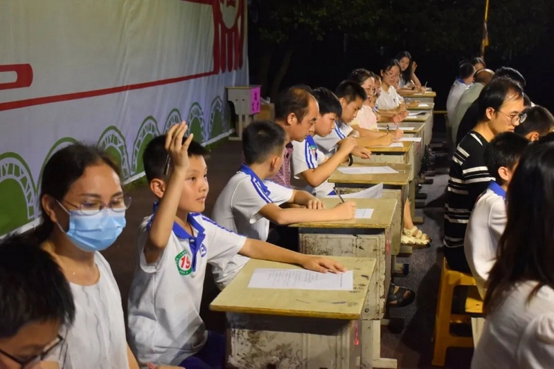 初选赛共10题,邀请了十位计分老师为20名选手监考并打分。肖文敏老师用敲锣的方式提示答题时间。随着一声声锣响,选手停笔,看大屏幕的答案,答对的兴高采烈,高举的手给所在班级的同学看到了,引来一阵阵喝彩和掌声。最后的结果是:第一名、341班10号选手文亚博,第二名、342班12号选手蔡旺,第三名、344班15号选手贺泉,第四名、329班4号选手李佳盛,第五名、347班18号选手张洋,他们即将进入攻擂赛。趁计分老师与统分老师交接的空隙,主持人与台下蠢蠢欲动的同学出了十个必答题,台下同学答题声响震动整个运动场,热情洋溢。