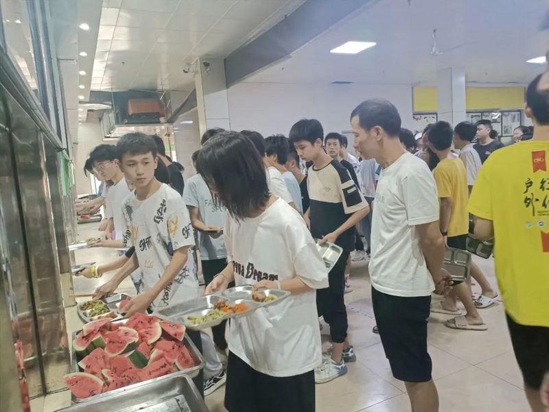 昨晚抵达长沙,罗校长又是忙到凌晨,清晨却特意早起,五点多就开始在校园各处梭巡检视。耒阳正源家庭农场昨夜鲜摘的瓜果蔬菜已经连夜运到长沙,西瓜安排在中餐晚餐做自助水果,豆角、茄子也是中餐晚餐的菜品,唯有辣椒早餐就已“抢鲜上市”。因为面向省城,同时也有充裕的费用支撑人工开支,长沙正源食堂的早餐入乡随俗,供应的是长沙本地喜闻乐见的煨码粉。青椒肉丝、豆笋肉片两种盖码正好可以用上太平圩乡山村里鲜摘的“本地辣椒”。太平青椒的画龙点睛之下,今天的米粉又辣又香,特别开胃,配上自助的花卷、馒头、包子、鸡蛋、白粥、绿豆沙……闻鸡起舞耗费的能量补充得元气满满,紧张而又充实的一天学习时光正式开启。