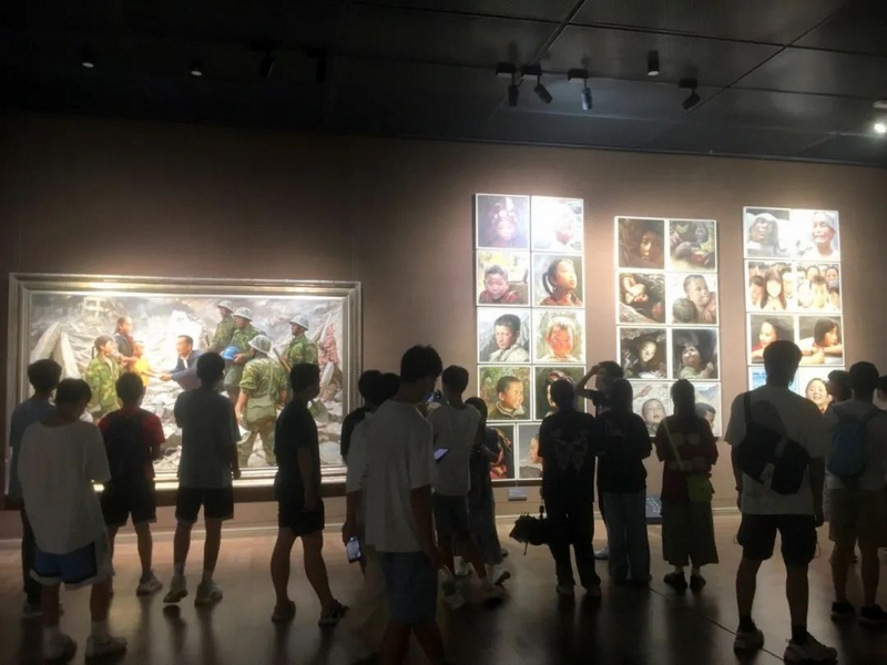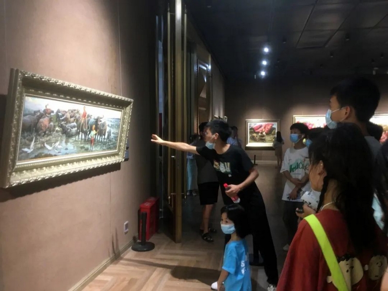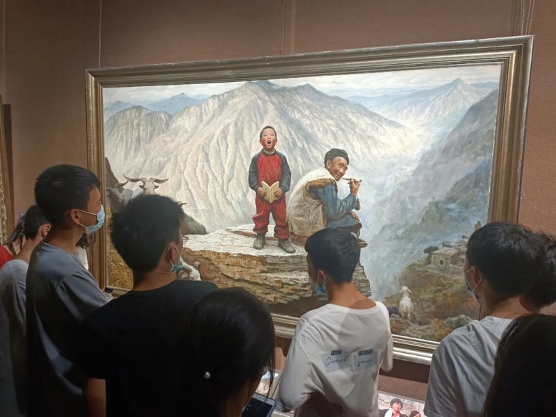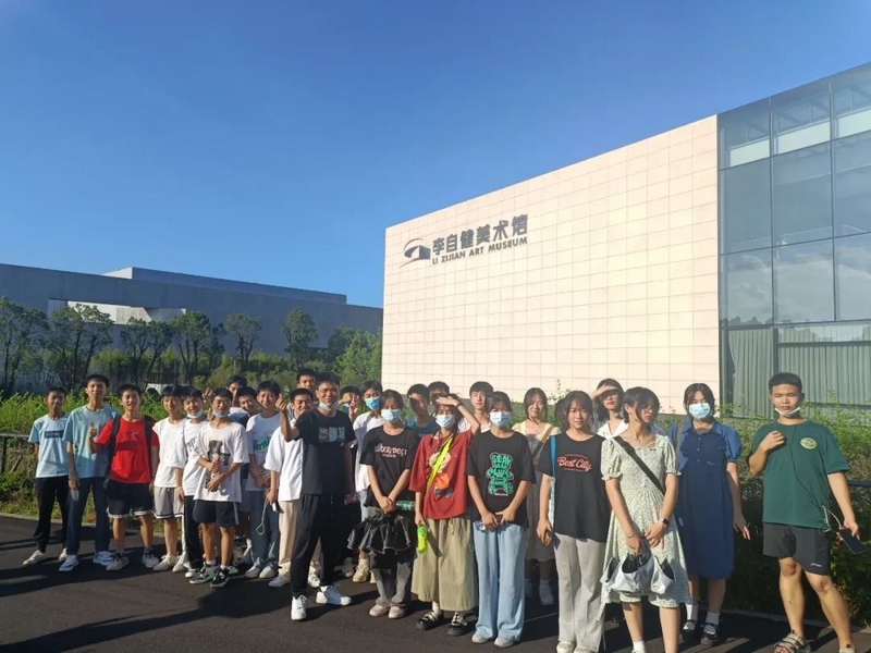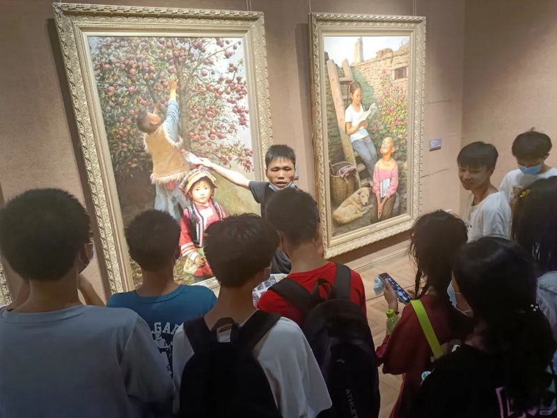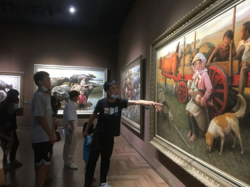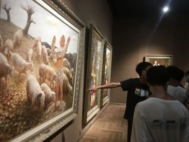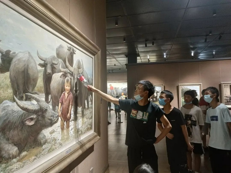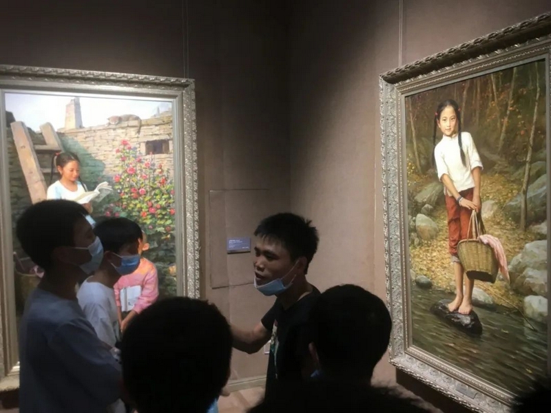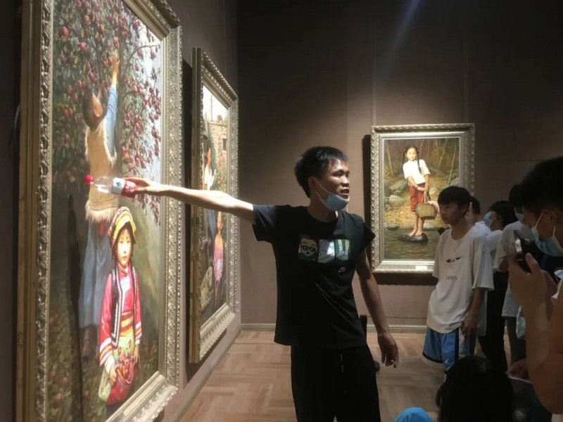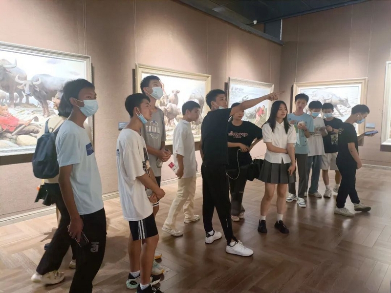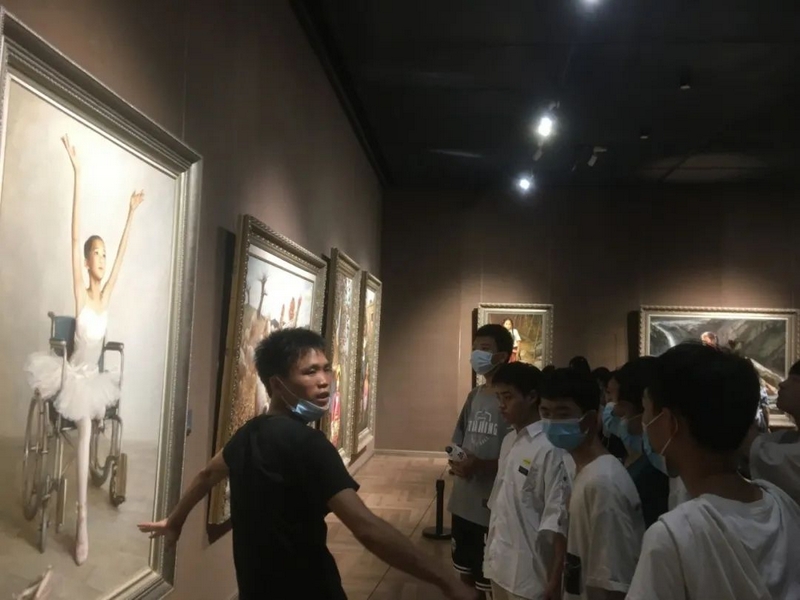 长沙素有“四大火炉”之称,火辣辣的正午骄阳下,贺老师带着大家直奔地铁3号线中南大学站,下地铁又继续顶着太阳一路前行来到李自健美术展览馆。作为国内最大的个人美术馆,琳琅满目的油画将三层楼的展厅挂得满满当当,名家画作、大家藏品俯仰皆是,这里对来自县城的农村孩子来说无疑是一座遍布宝藏的艺术殿堂。这里规定五点闭馆,排队进入展厅已近下午三点,顾不上一路跋涉与满头汗珠,贺老师马不停蹄带着同学们参观,一幅一幅讲解构图、线条、明暗、冷暖、远近、虚实、支撑、对比……结合课堂知识和练画实践,引导同学们从优秀名作当中汲取养分,吸收经验。游弋在艺术的海洋之中,同学们获益匪浅,流连忘返,闭馆时间是下午五点,大家恋恋不舍地走出展厅时已是五点半。