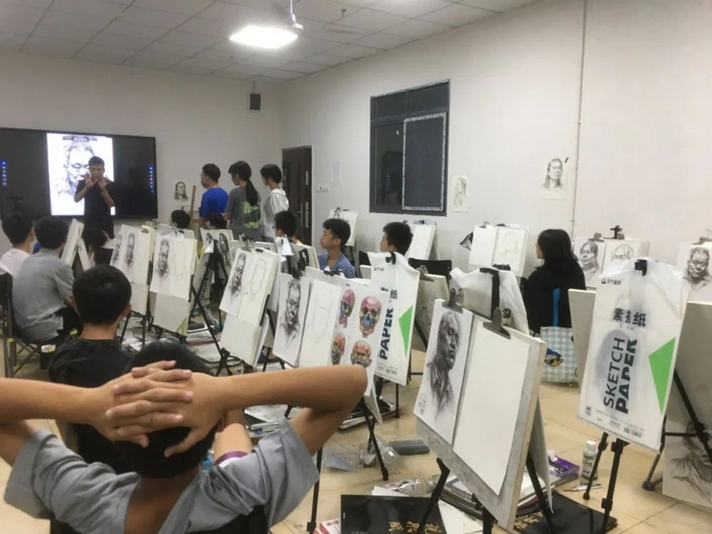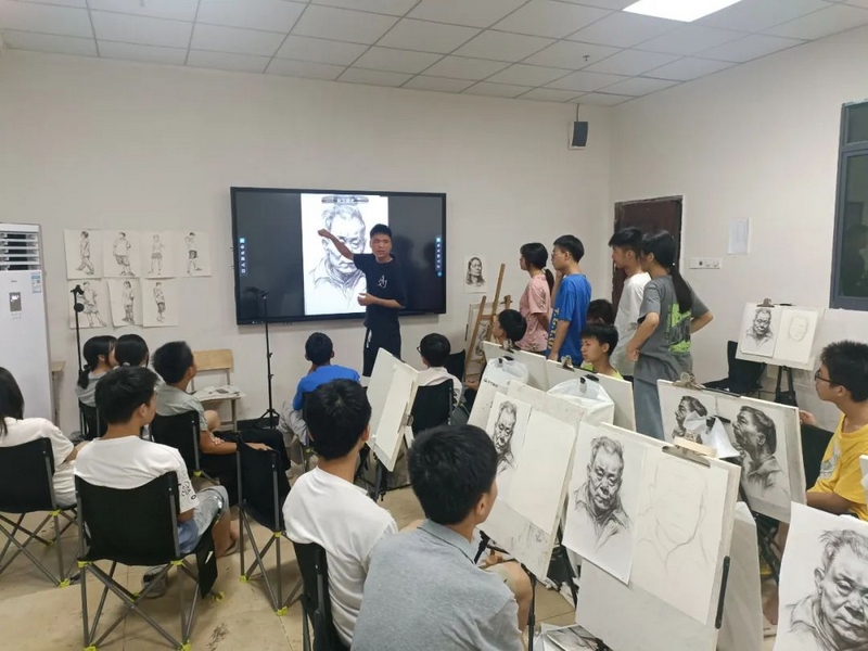 新高二画室里,中国美院雕塑系毕业、有着十多年画室培训经验的贺小华老师,在触摸大屏上开启批注模式,给学生讲解肖像素描。昨晚速写课上被清华美院黄兰毅学长评价“考清美央美潜力很大”的邓智龙、唐述奕、黄子彤、汤馨几位同学,都是从小学、初中开始进行美术专业培训。他们热爱画画,功底扎实,来到长沙集训才半个月,专业水准又上了一个新台阶:“这边集训课程紧凑,各项专业训练系统化,黄老师、贺老师稍微一点拨,有时候就感觉豁然开朗,那种突破的感觉太好了。”贺老师的严厉执著、黄兰毅学长的刻苦坚韧,同学们亦步亦趋甘之若饴。