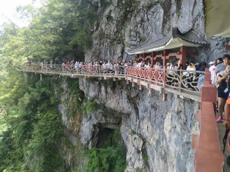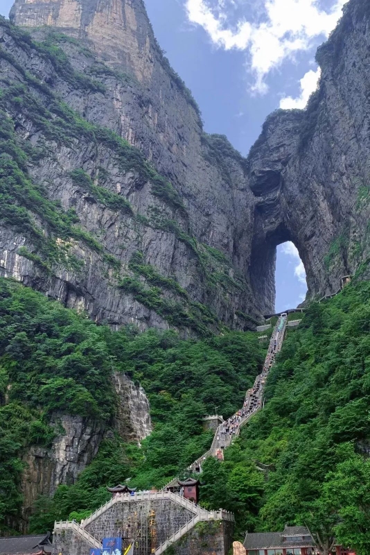 第四天,大家攀登期待已久的天门山。天门山海拔1518.6米,是张家界海拔最高山,也是张家界的文化圣地,被尊为“张家界之魂”。乘坐缆车登山时,大家纷纷感叹造化神奇的冠世奇观。仰视山顶,俯瞰山下,小学部周运根主任情不自禁地吟诵:“大自然是伟大的,人类更伟大!”天门洞,高131.5米,宽50余米,南北对开于千寻素壁之上,是罕见的高海拔穿山溶洞。大家纷纷在天门洞前拍照留影。之后的穿山扶梯,玻璃栈道也是让大家叹为观止。