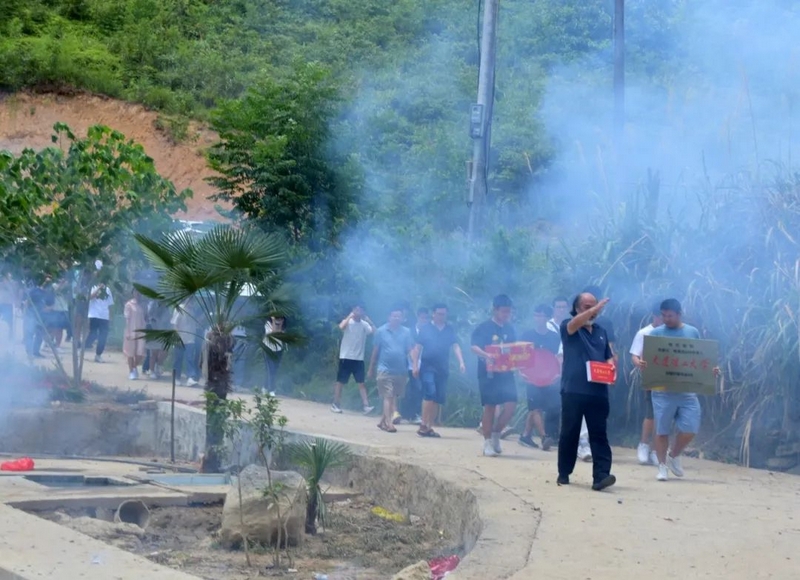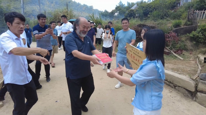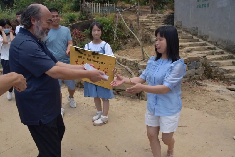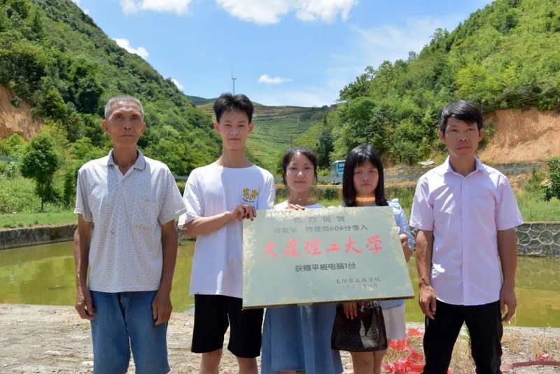 孩子考上名校,学校贺喜自不可少。刚从城里送完黄超奖牌的罗校长和班主任罗经飞一行,马不停蹄赶往清水湾。中午1点,罗校长贺喜队伍如期而至。一如过往的排面,鞭炮烟花争相斗艳中,班主任把铜匾授给了贺紫乐,罗校长把平板电脑递给贺紫乐妈妈贺洪娜。
