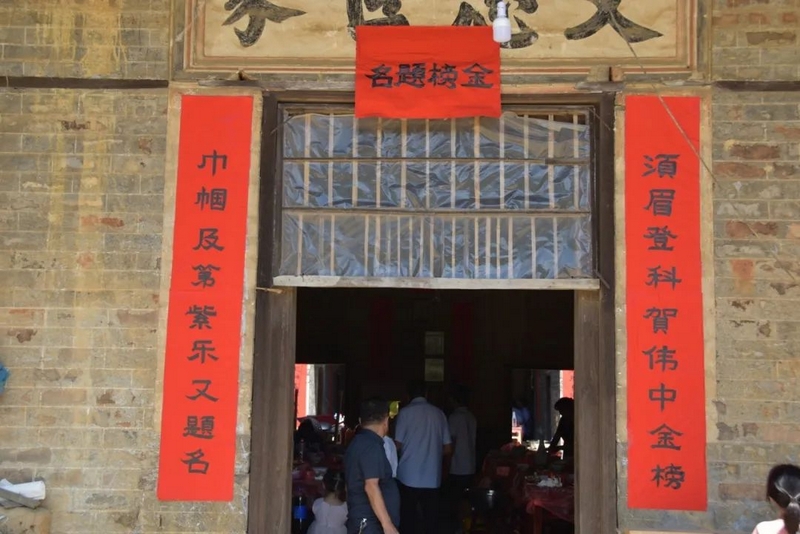 时隔一年,8月6日,太平圩乡城背村一组清水源湾的这座百年老宅,里里外外再次贴满了对联。进门处一副看似普通的对联却内涵玄机。上联:须眉登科贺伟中金榜,下联:巾帼及第紫乐又提名。横批:金榜题名。