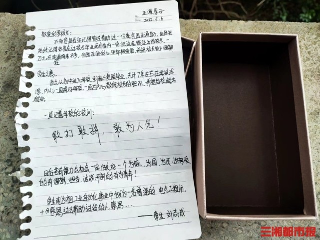 三湘都市报·新湖南客户端5月15日讯(全媒体记者 刘镇东)近日,耒阳正源学校收到了一个特殊的小礼盒,礼盒里是一封信和一沓沓的百元现金,10张一沓,整整10沓。寄过来这一礼盒的主人,是6年前从该学校毕业的刘志成。