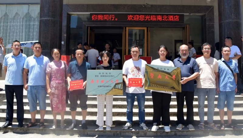 酒店门口合影,罗校长发言底气十足:今天小水双喜临门,李慧和李箴婧同学分别考取南京理工大学和暨南大学,让我们为她们点赞!