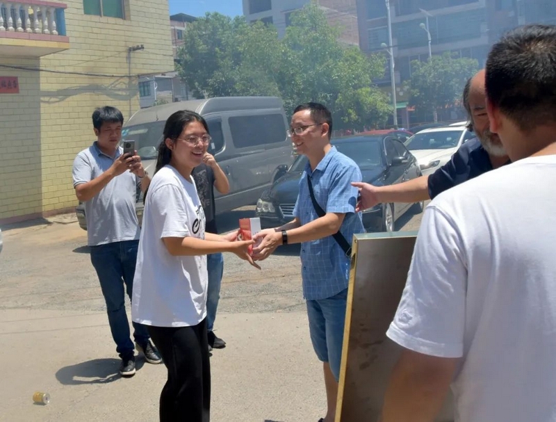 12:10,罗校长率老师和同学抵达酒店门口,意气风发的罗校长一行在鞭炮和礼花声中向考取暨南大学的李箴婧和考取南京理工大学的李慧贺喜。