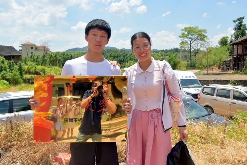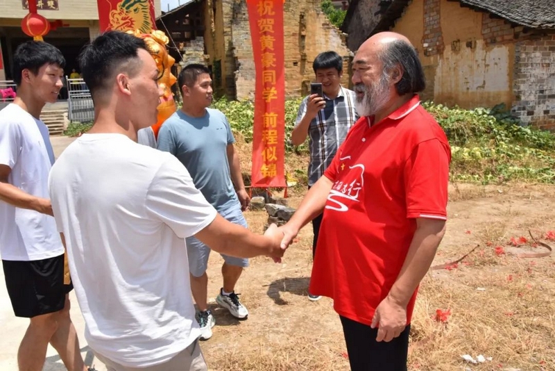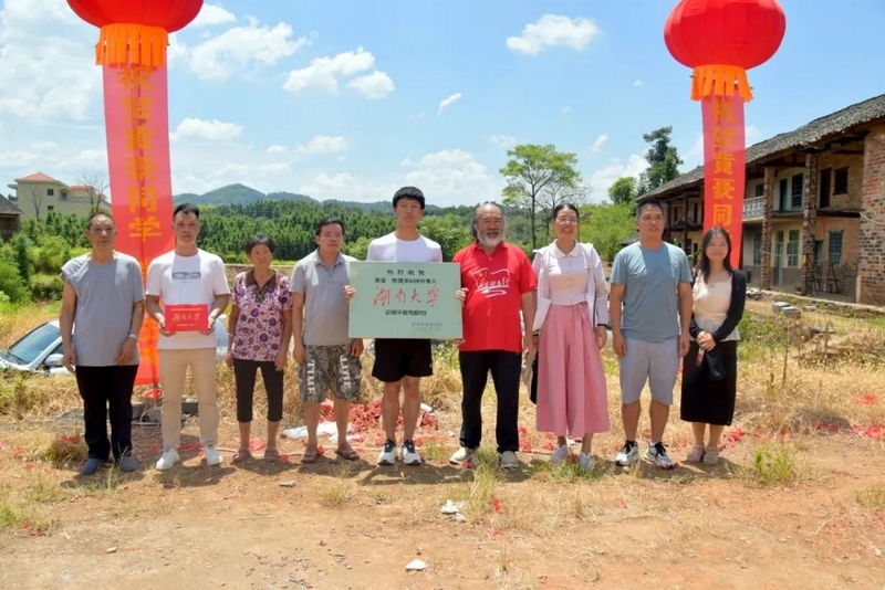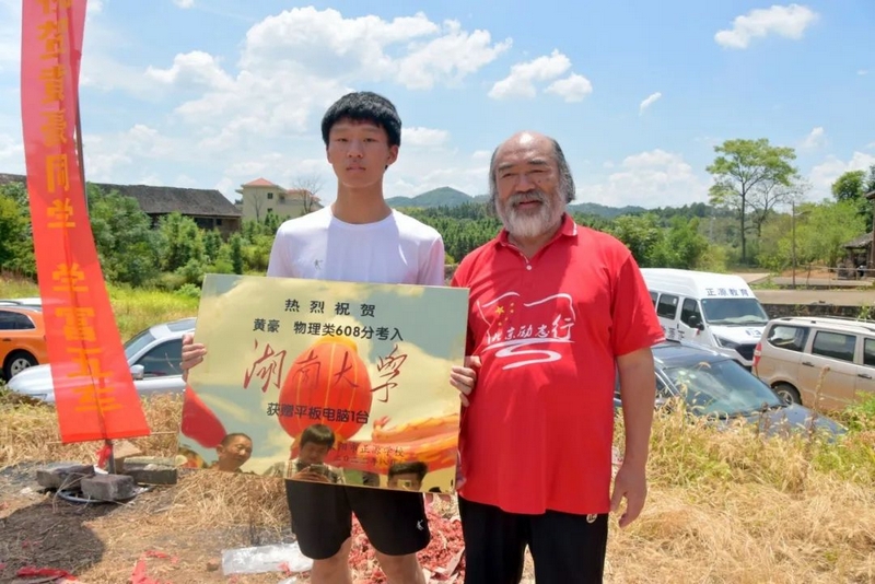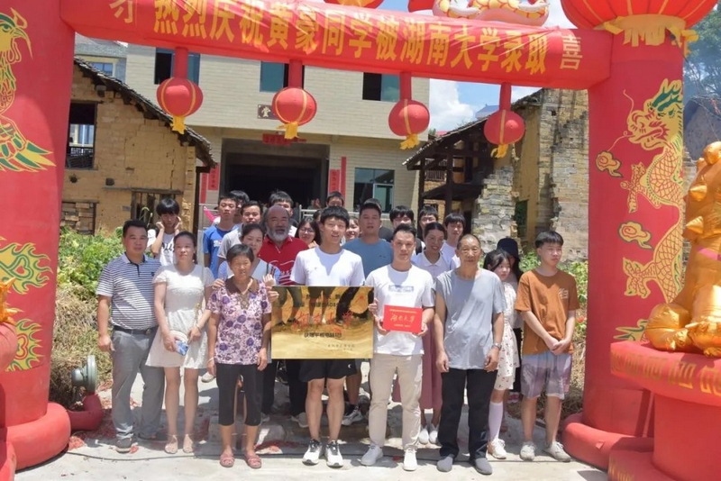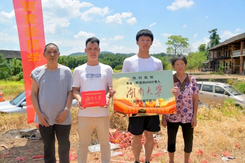 中午12点多,罗校长率高203班班主任罗经飞、科任老师和同学们来到文佑坳,祝贺黄豪608分考取湖南大学。