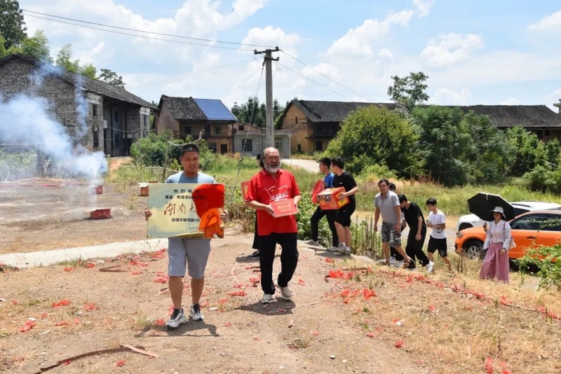 罗校长一行甫一下车,鞭炮礼炮齐鸣,掌声雷动。罗校长双手捧着学校高考奖品华为平板电脑,亲自交到黄豪父亲黄正芳手上。黄豪一脸幸福地从班主任罗经飞手中接过恭贺铜牌。一时间,恭贺声、感谢声融和着鞭炮礼炮声,不绝于耳,小小湾村沉浸在一片热烈的喜庆气氛之中。