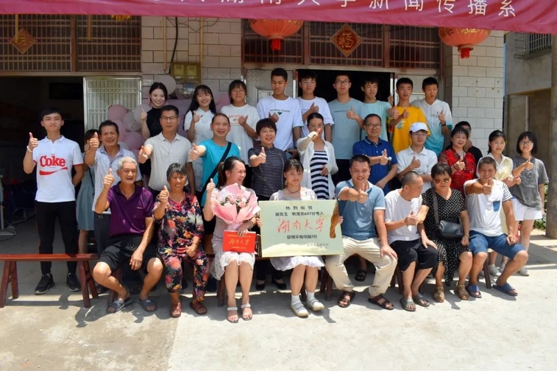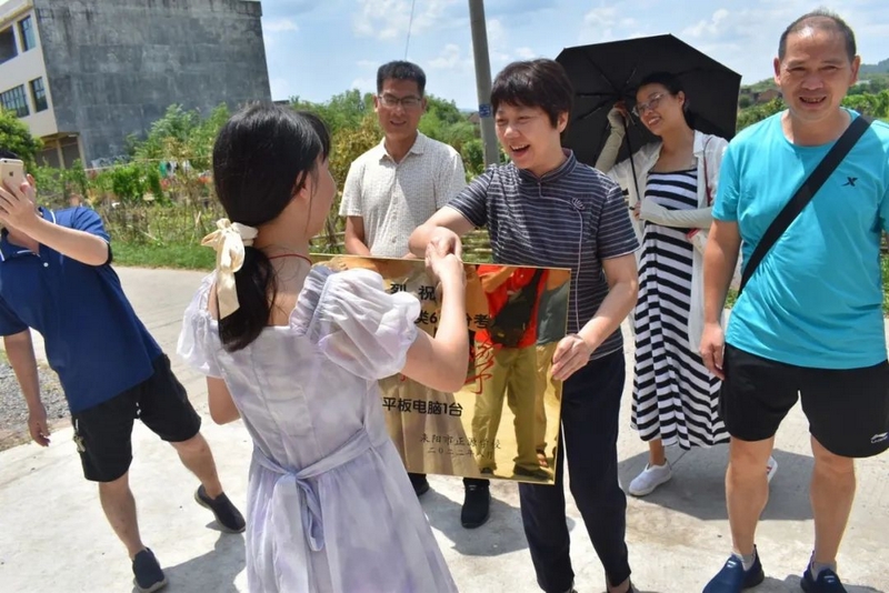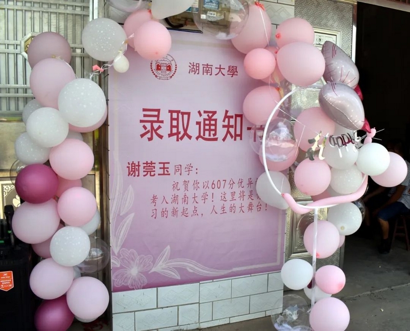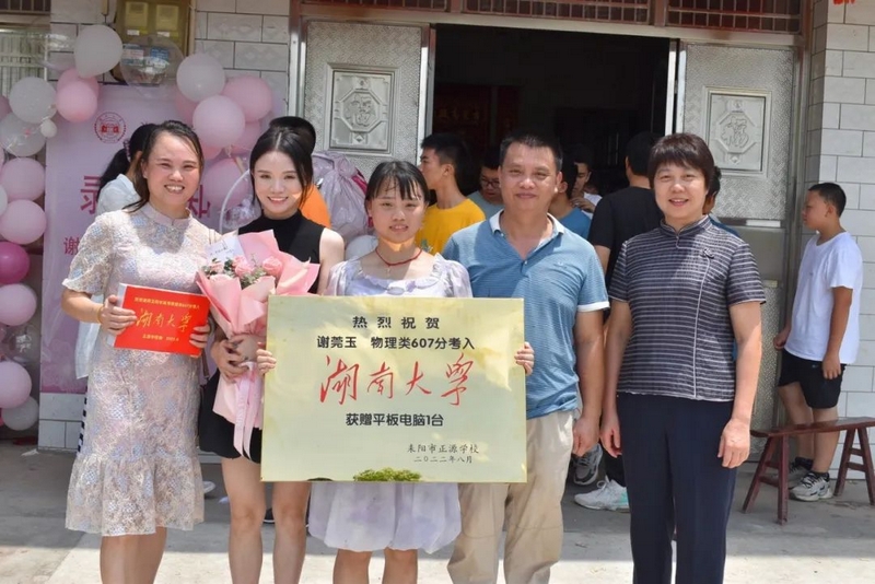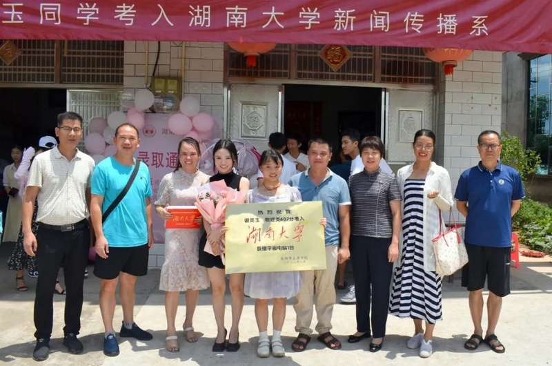 8月16日,校财务总监、校长夫人梁晓芬率校团委书记周文根和初中、高中老师、同学们共三十余人,分乘3台小车、1台大巴来到夏塘镇新生村4组。同学们抱着鞭炮、礼花,老师们端着铜匾、华为平板电脑,一路浩浩荡荡进村祝贺谢莞玉607分被湖南大学录取。
