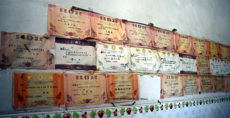 之所以初中高中的奖状要贴到父母在东莞的房子里,一方面是老家的墙上贴满了小学的奖状,空间不够。另一方面,她是留守儿童,父母除了过年回家,平日都在东莞。初中开始,每年寒暑假谢莞玉都是独自一人坐火车、转汽车去往东莞跟父母团聚,顺便把一个学期里拿到的奖状带去给父母过目。