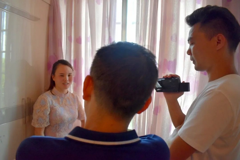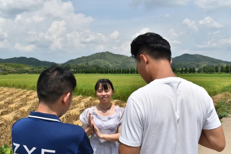 谢莞玉家就在夏塘镇新开发的稻花公园旁边。11点钟在稻花公园取景时已近正午,气温直逼40度,阳光暴烈。田畔上的树荫下,换了很多角度,摄像机总是调不到适合的光线。阳光暴晒之下,树荫下的画面很是暗淡。摄像的岑涛老师左顾右盼、抓耳挠腮之际,谢莞玉主动提出,到阳光下去,她不怕晒,能坚持,“以后学新闻传媒,迟早要适应日晒雨淋的。”
