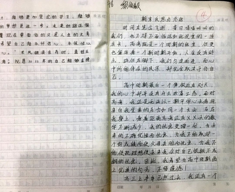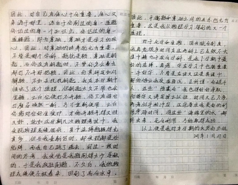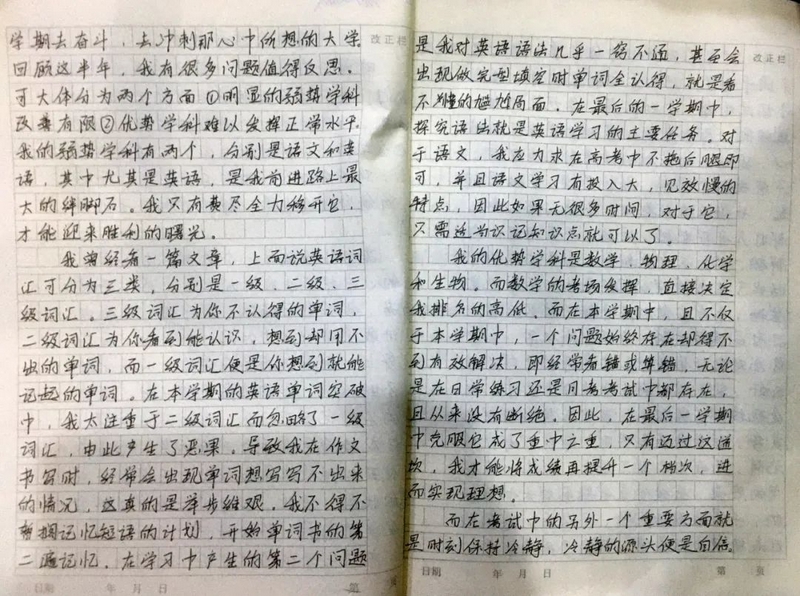 高三下学期开学,高考百日冲刺前的最后一次“学习总结”,黎俊毅写了整整5页,一半的篇幅都在分析自己最为弱项的英语学科,“题目是锁,基础是钥匙。”痛定思痛的分析应对之下,他终于在最后的冲刺关口找到了适合自己的钥匙,及时将英语短板补上一大截,高考英语突飞猛进到了116分。