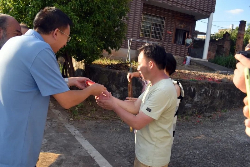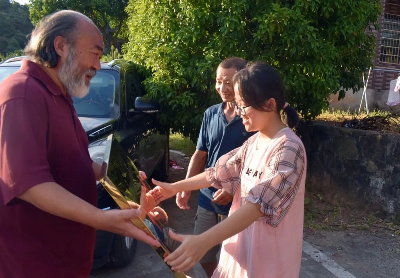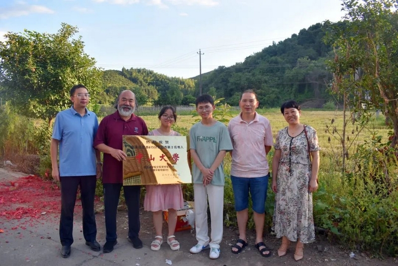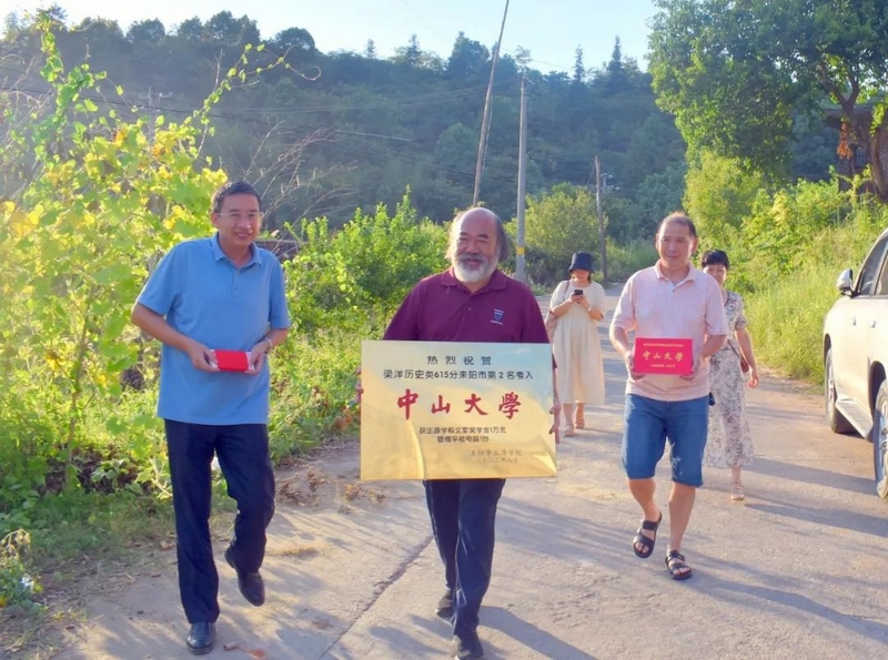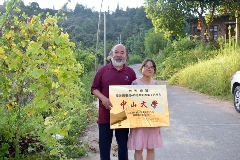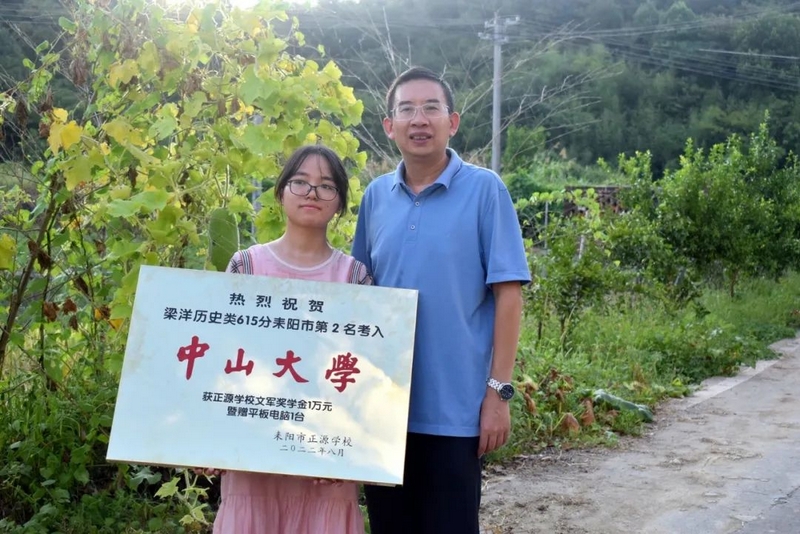 8月19日下午,罗校长和高三年级主任、文科196班班主任钟琼佳,初中学部副主任、语文教研组长周文根及老师们带着恭贺铜匾、华为平板电脑及1万元文军奖学金,来到泗门洲江冲村梁家湾,祝贺梁洋以历史类615分、正源学校第二名,也是耒阳市第二名,被中山大学录取。