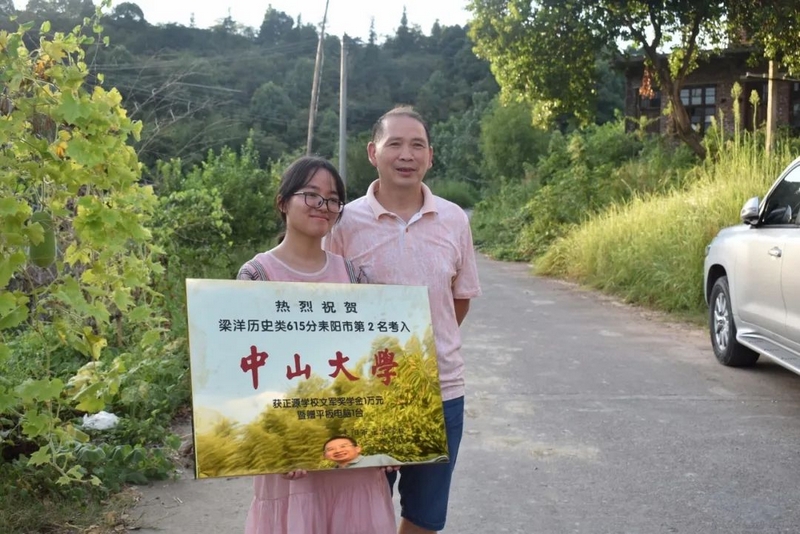 “我们的梁洋和江心怡,一个中山大学,一个武汉大学,都是十大名校。还没算我们物理类十多个名校生,一个文科班就考出两个名牌大学生,可喜可贺!”