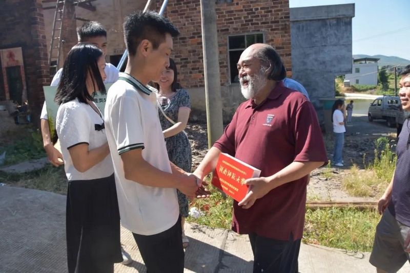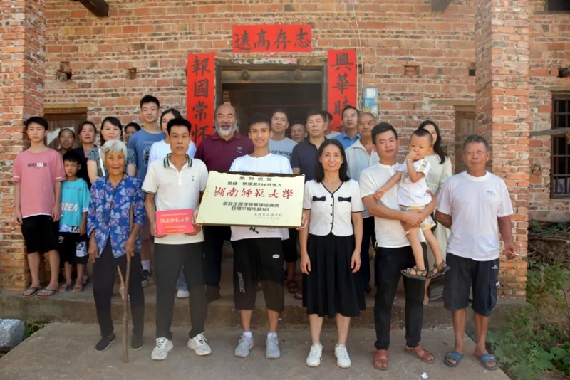 一如到其他同学家一样,罗校长率年级主任钟琼佳、复读班班主任李利青,以及应届班班主任刘满根、化学老师邓名扬等一行到达曾健的湾村公平群丰二组,烟花爆竹齐鸣,众亲友和乡亲们在祠堂前迎接或者看热闹。