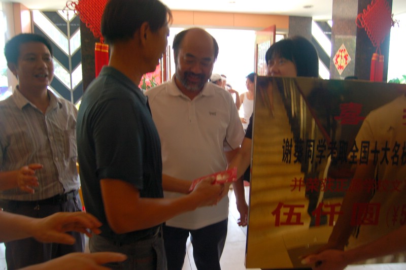 为考取全国十大名校武汉大学的谢琳同学颁奖(8月17日)