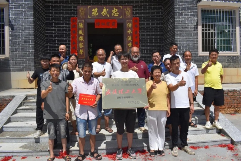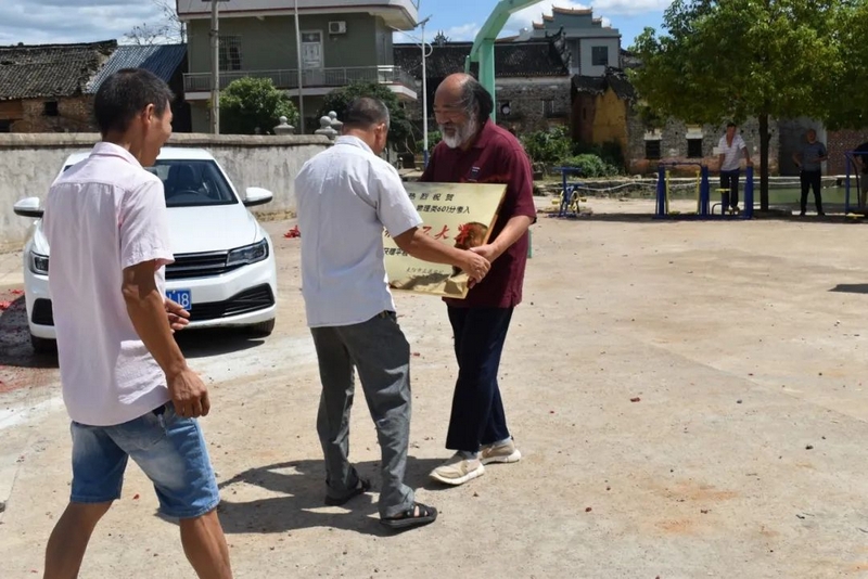 迎接罗校长一行的仪式庄重而热烈,郭征威家老幼和众亲友顶着烈日在祠堂前禾坪列队欢迎,罗校长一行一下车,烟花爆竹齐鸣,主家众人上前握手道谢,恭敬而热情,就像老熟人一样。