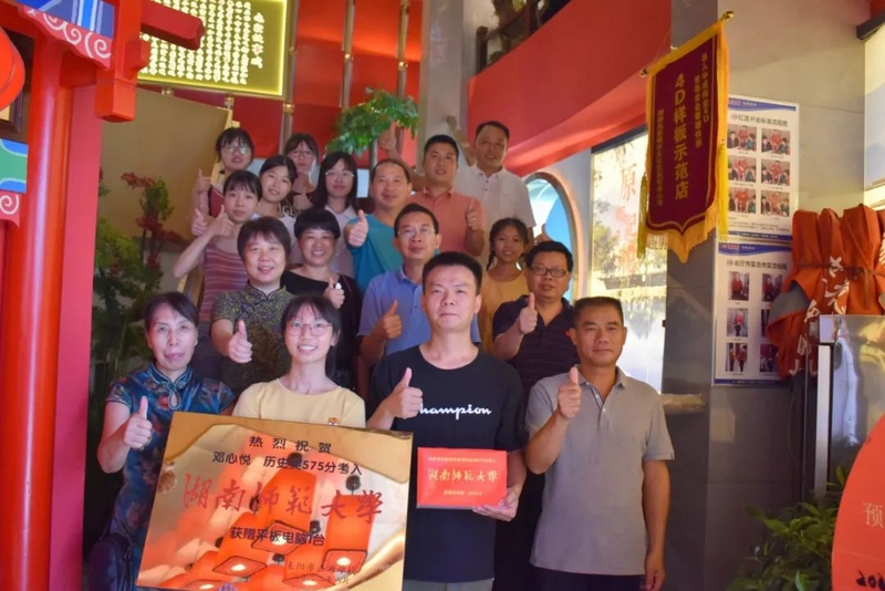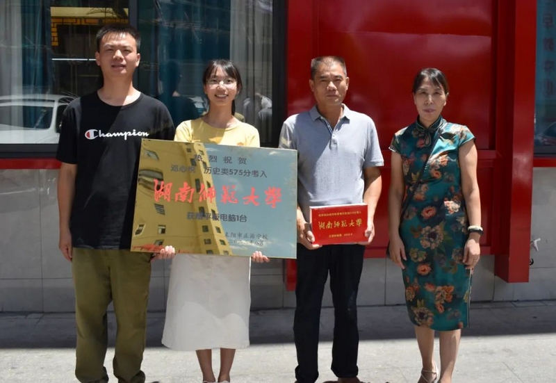 8月25日,校长夫人、校财务总监梁晓芬率高三年级主任、196班班主任钟琼佳以及初中高中任课老师和同学们,带着恭贺铜匾和华为平板电脑,来到城区酒店,祝贺邓心悦历史类575分被湖南师范大学外国语学院录取。