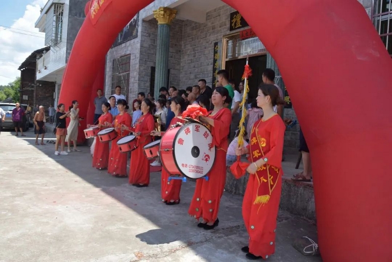 临近鲁碑村一座新建祠堂,几十米長且宽阔的进村路停满了车,鲜艳的拱门和气球在青山绿水的映衬下大气又喜庆。鲁碑军鼓队整齐排列两边,在鼓队指挥棒的引领下,鼓声节奏欢快,让人心潮澎湃,烟花爆竹更是点燃了现场激情。