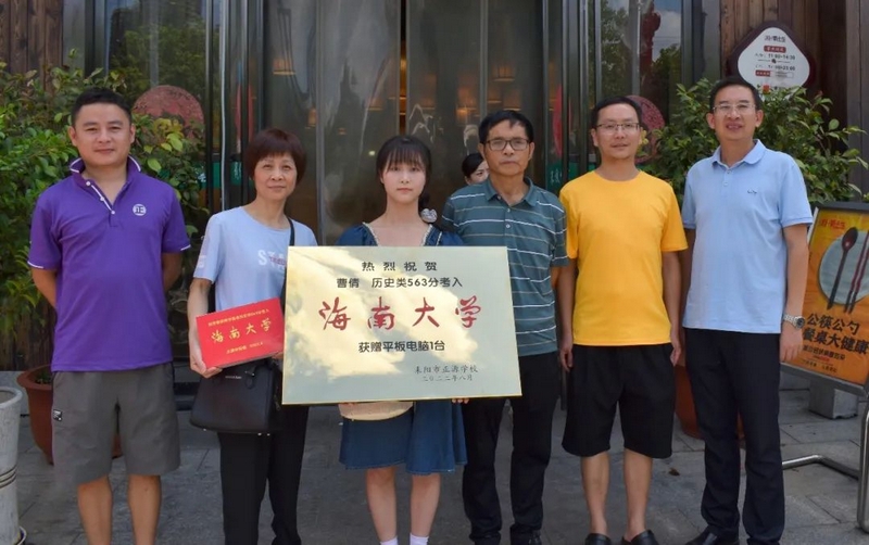 8月29日,我们随着高三年级主任钟琼佳、复读班班主任向苏老师和任课老师们,带着恭贺铜匾、华为平板电脑来到城区酒店,祝贺曹倩历史类563分正源文科第十二名被双一流211海南大学录取。