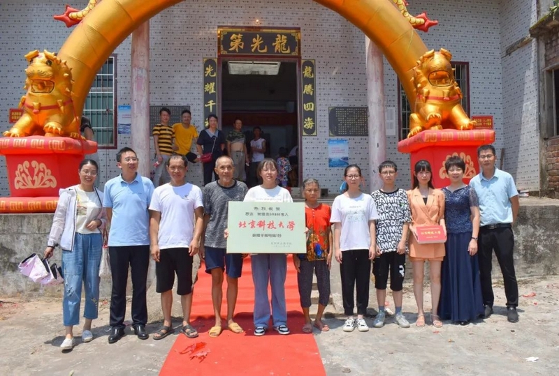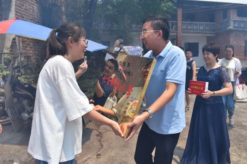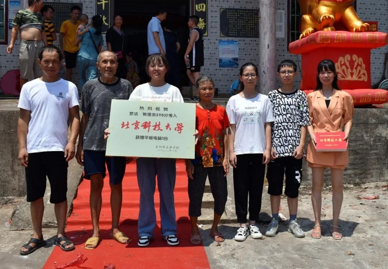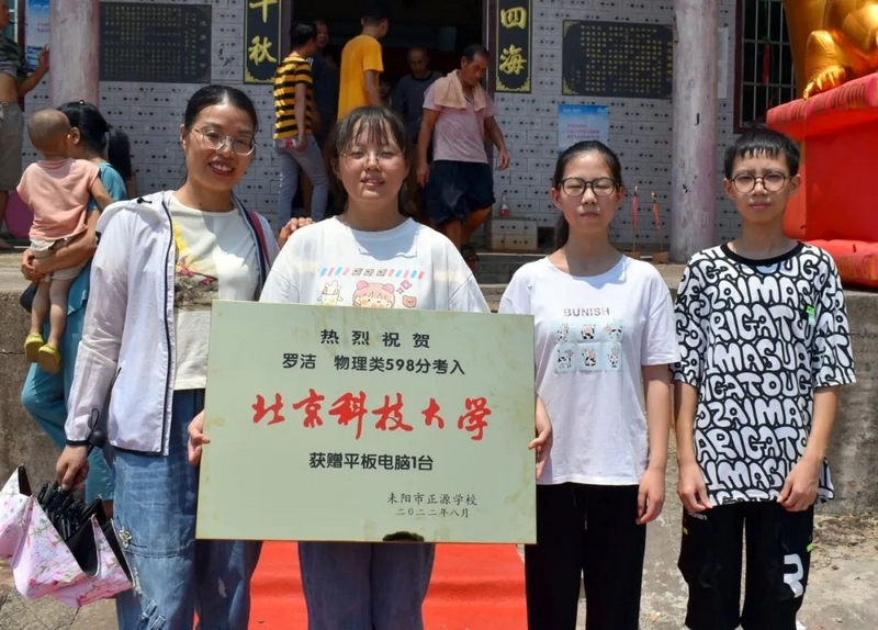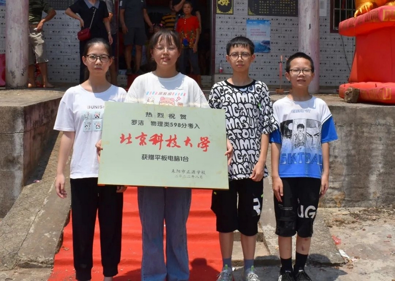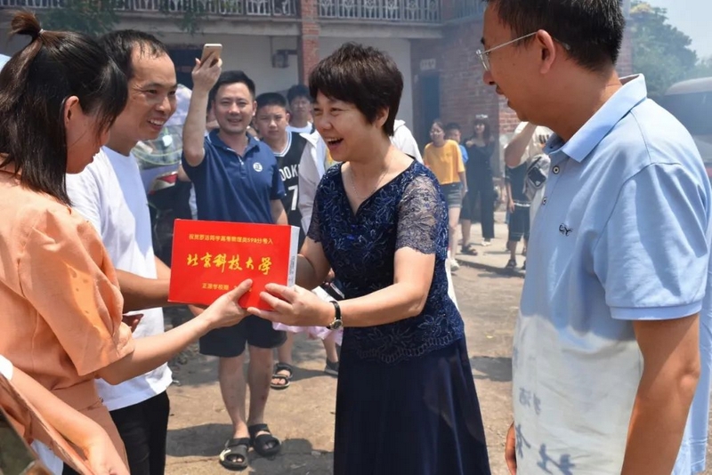 8月24日,校财务总监梁晓芬老师和高三年级主任钟琼佳率任课老师们和25位同学,带着恭贺铜匾、华为平板电脑浩浩荡荡来到淝田镇五岳村23组大屋场村,祝贺罗洁物理类598分被北京科技大学录取。