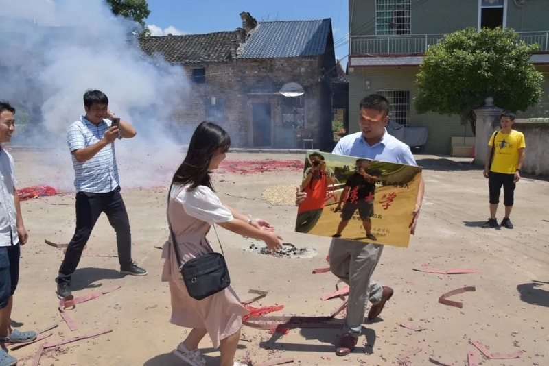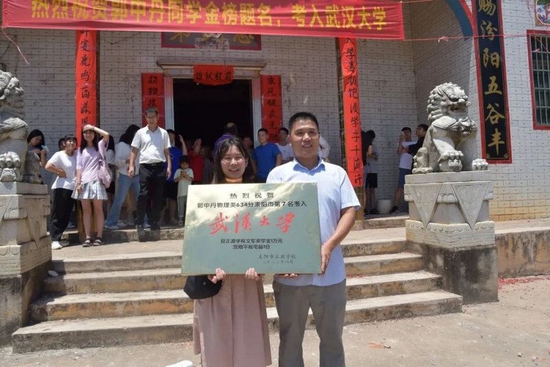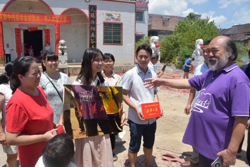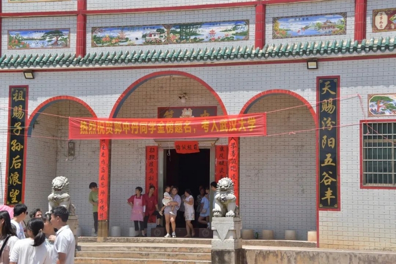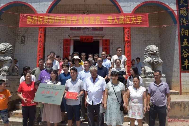 8月14日,公平镇大路村郭家湾祠堂的前坪摆满了烟花爆竹,祠堂里高朋满座,大门上方一条“热烈祝贺郭中丹同学金榜题名,考入武汉大学”的横幅耀眼醒目。