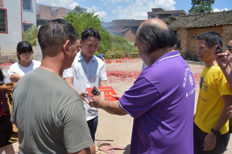 刚从小水镇李乐泉家里吃完早餐的罗校长率领贺喜团队,顶着烈日,马不停蹄的来到公平山口村,车刚停稳,祠堂内外沸腾了起来。