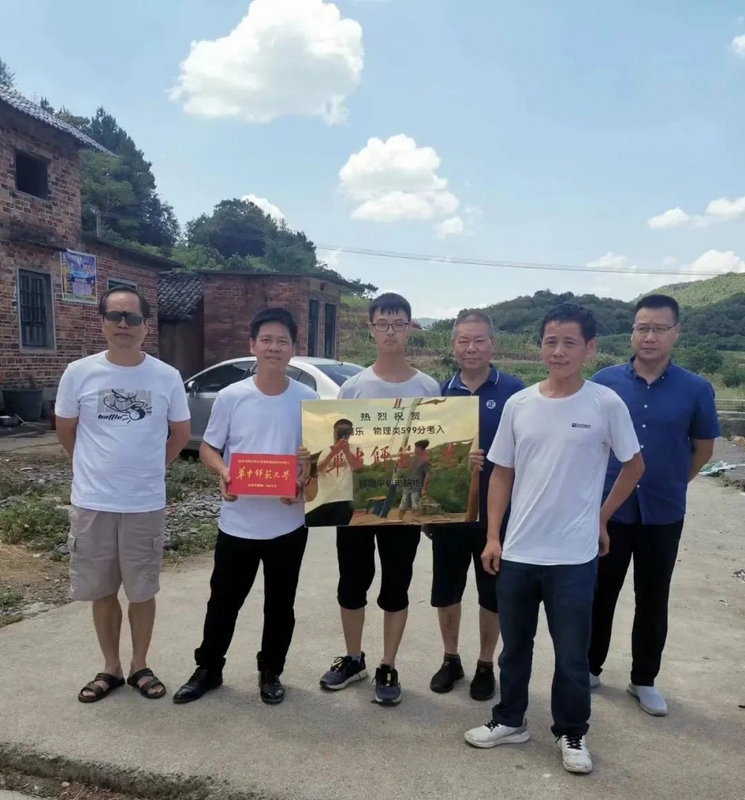 8月15日,校资料中心主任、邓嘉乐化学老师李康活和率初高中老师和同学们带着恭贺铜匾、华为平板电脑来到余庆水口村,祝贺邓嘉乐599分被华中师范大学录取。村子里鞭炮轰鸣、礼炮冲天、喜气洋洋。