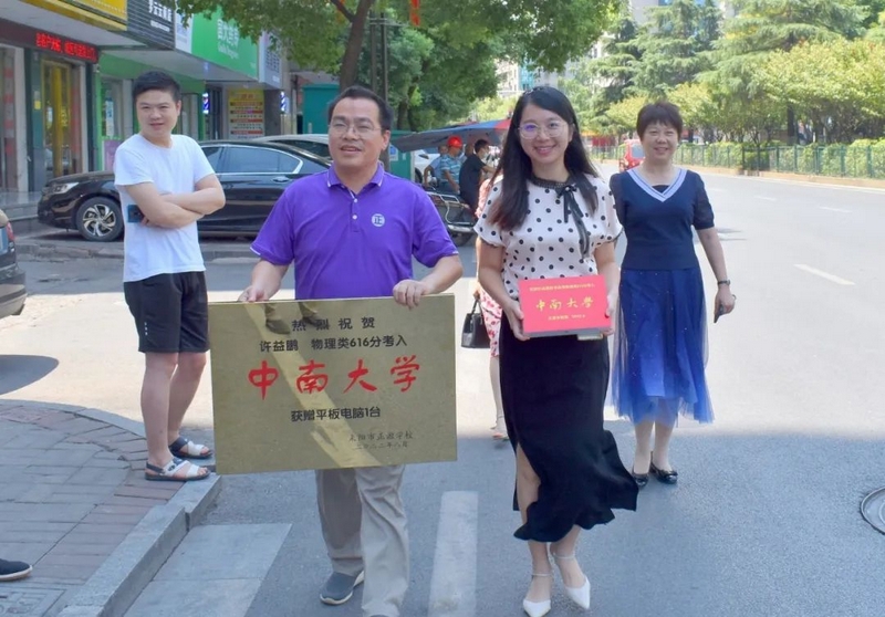 “热烈祝贺许益鹏物理类616分考取中南大学”铜匾在手头金光闪闪熠熠生辉,这位上穿一件篮球背心,下着一条运动短裤,脚蹬球鞋矗立C位的精神小伙,就是今天升学宴的主角许益鹏。