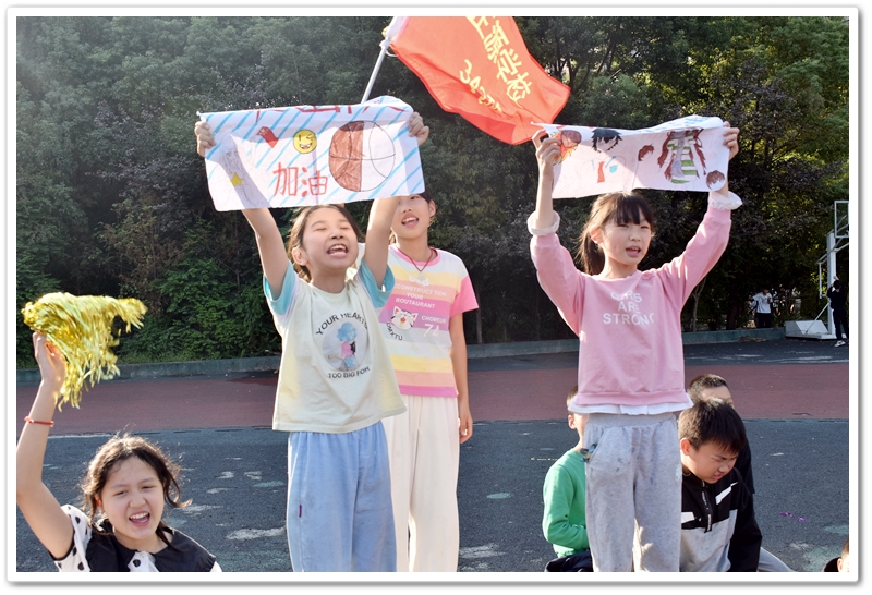 球场外,各班观战的同学组成的啦啦队也不断地为队友呐喊助威,舞动着班旗、挥着自制小海报,同学们伸着脖子,或举着海报,或摇旗呐喊,球场上沸腾起来啦,一声声起伏的欢呼声、喝彩声、加油声不绝于耳。