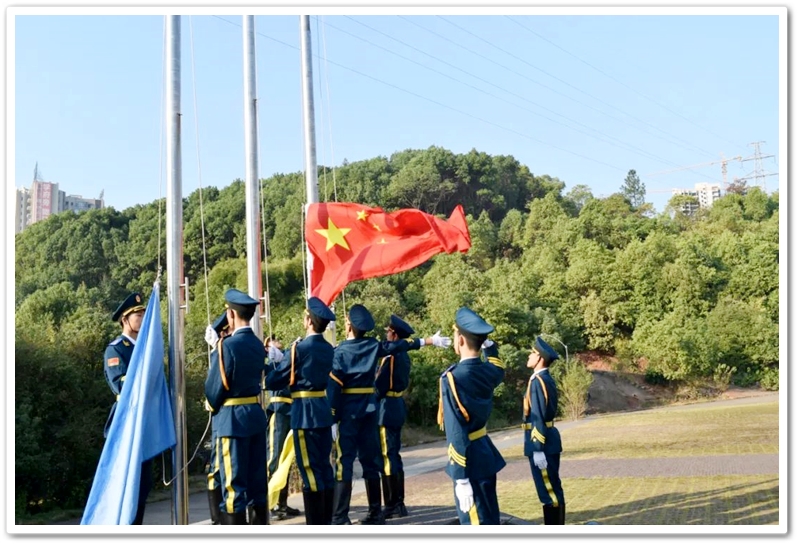 7点40分,国歌奏响,全场肃立。五星红旗冉冉升起,全体师生庄严肃穆面向国旗行注目礼。