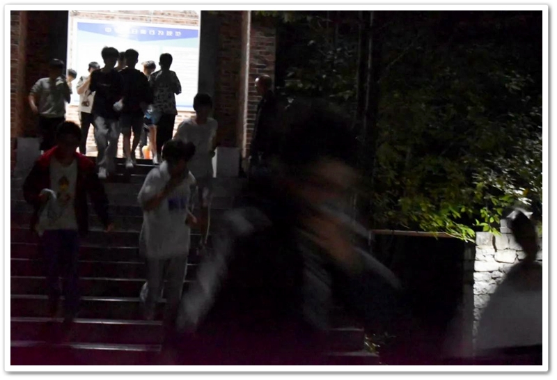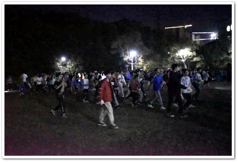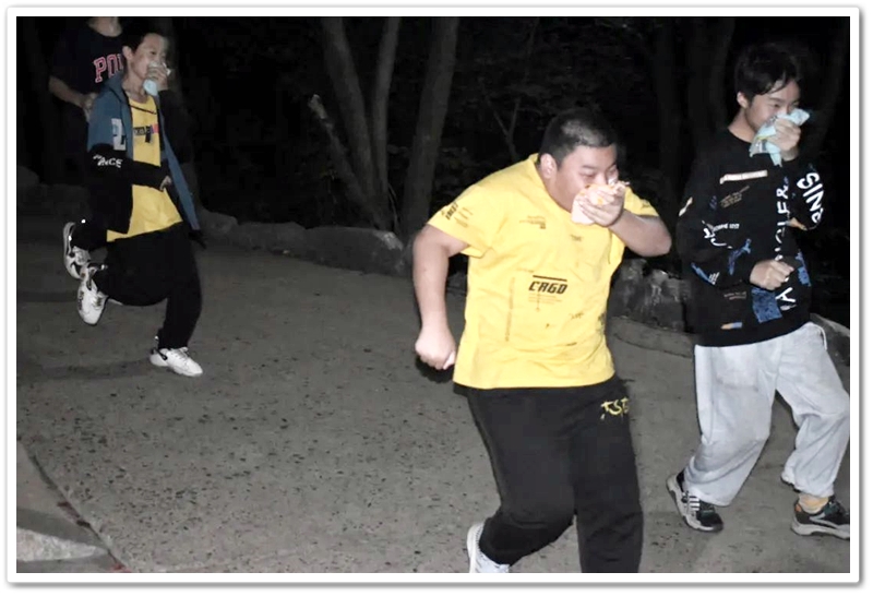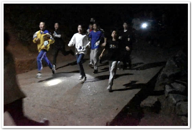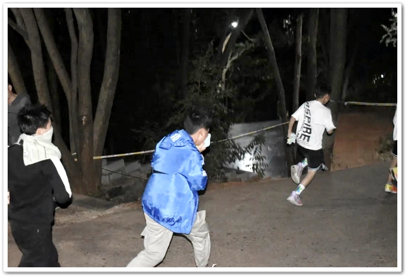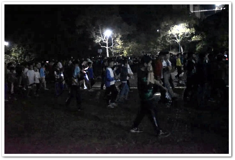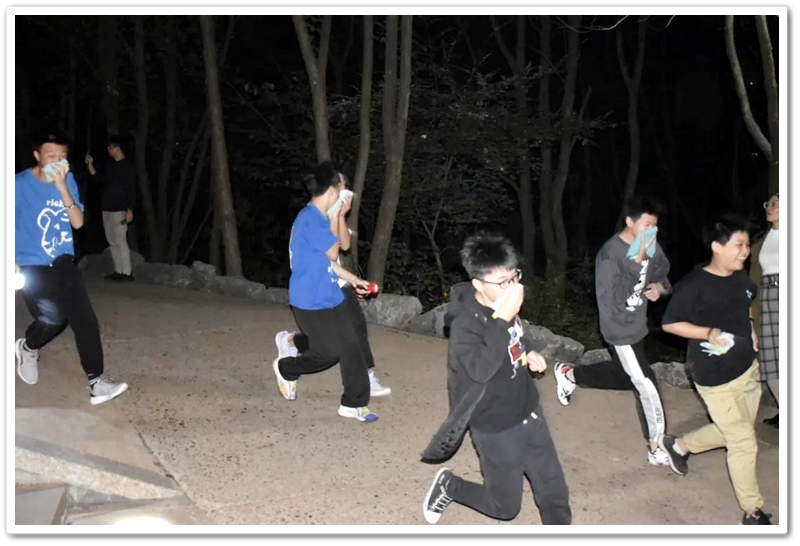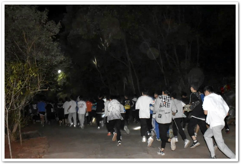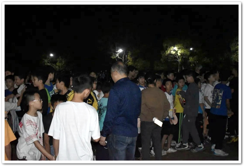 第二轮模拟深夜熄灯演练,前栋学生抵达正源广场完成疏散集结耗时3分12秒,后栋学生抵达半山亭完成疏散集结耗时3分3秒。