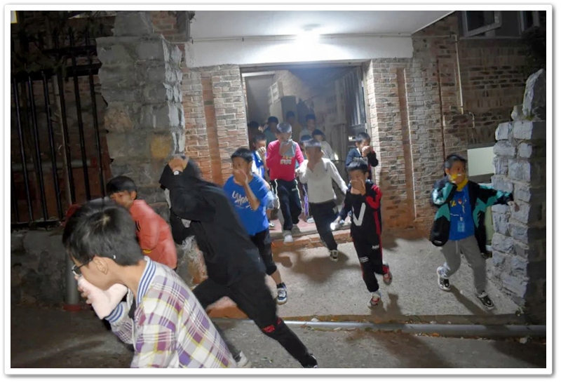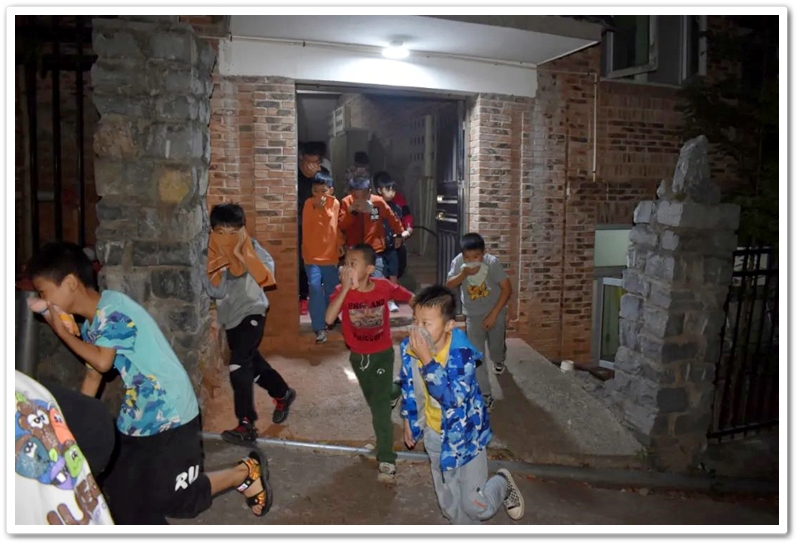今天参加消防演练的是艺术部和初一年级全体男生及小学五年级住在西苑宿舍的4个班级学生。