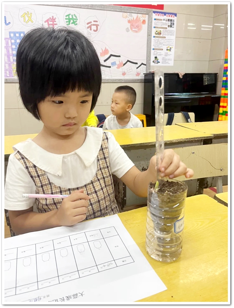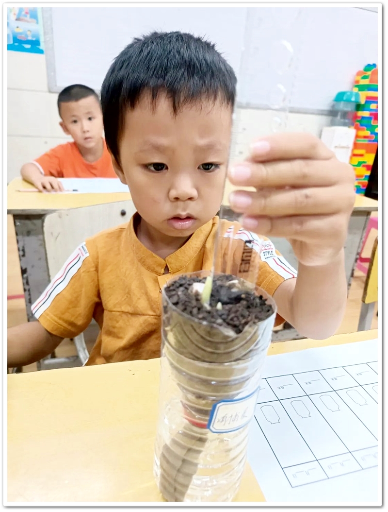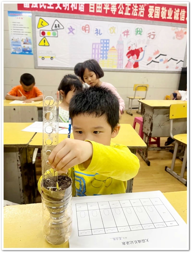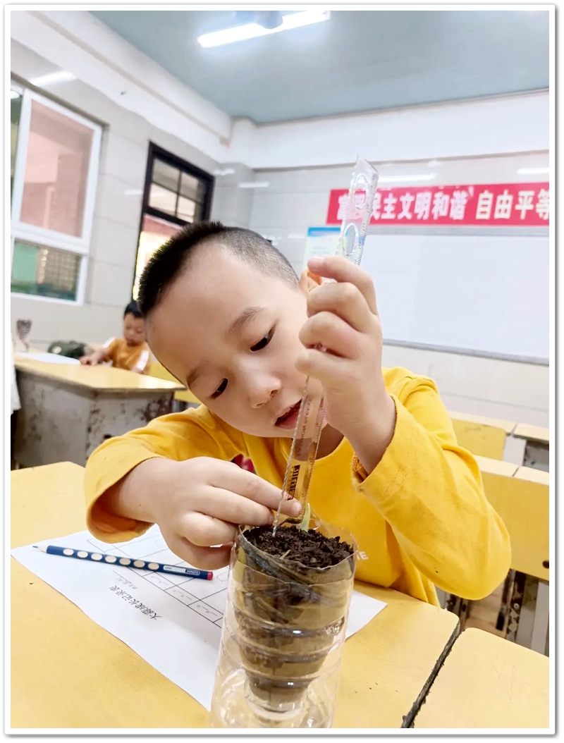 老师告诉大家,种植的时候,要先将蒜头在冷水里泡一泡,这样发芽会更快。当然,种植也是有技巧的,必须蒜尖朝上,蒜根朝下,让蒜子直立在土壤之中。瞧,它们多像一个个士兵,威武挺拔!