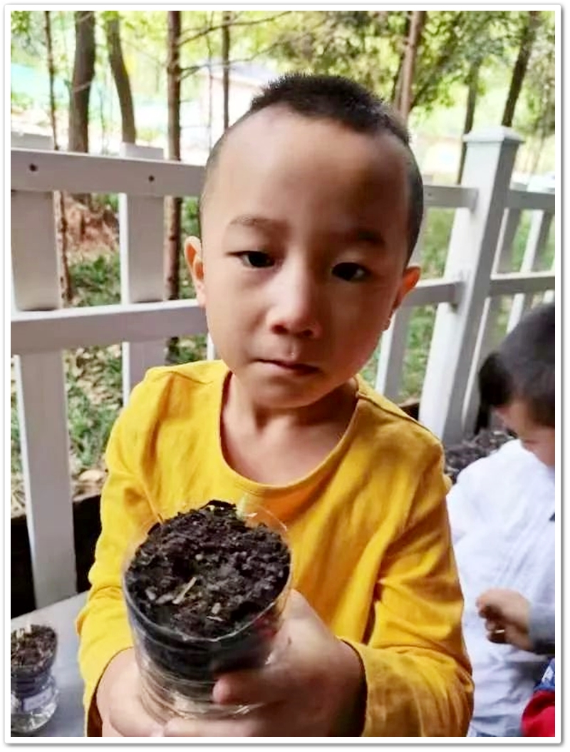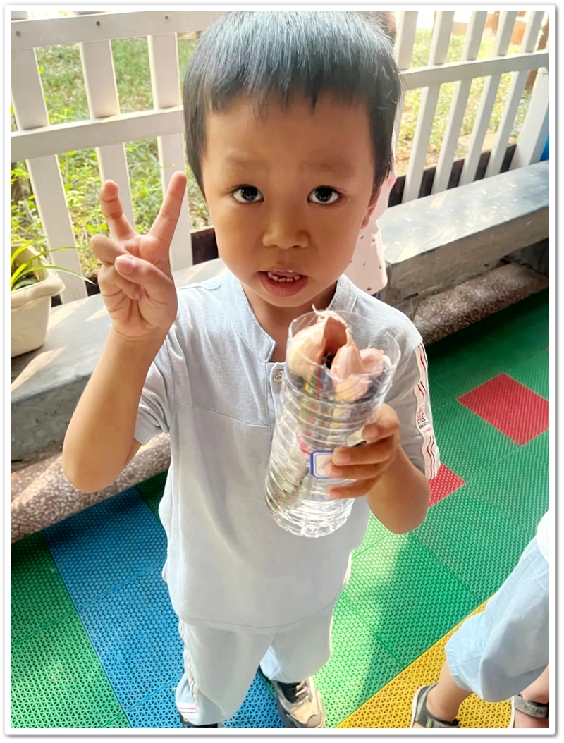 没有合适的空地,我们将种植的地点改在了幼儿园的走廊上。用捡来的矿泉水瓶子,废物再利用,做成了种植的容器。小朋友们和老师一起从校园的西山附近挖来营养丰富的黑色土壤,把它们装进瓶子里,蒜头们的“家”就准备好了。