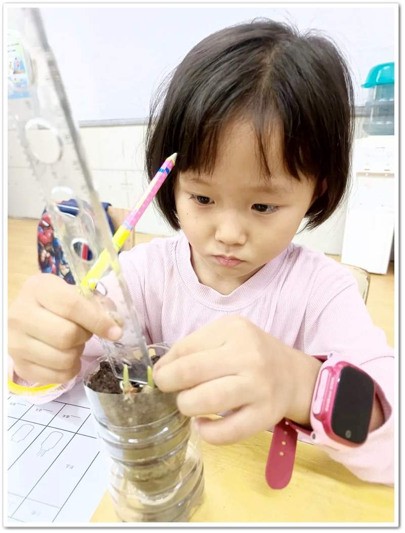 从白白胖胖的小蒜头,长到绿油油的大蒜,总共不到一个月的时间。大蒜们一天一个样,每天都能增高不少。有些孩子入园第一件事就是去看看自己的大蒜,惊喜于萌发的新芽和长高的蒜叶。孩子们隔三差五地用自己的画笔记录下大蒜的形态,同时在老师的指导下,学习使用尺子测量大蒜的长度。