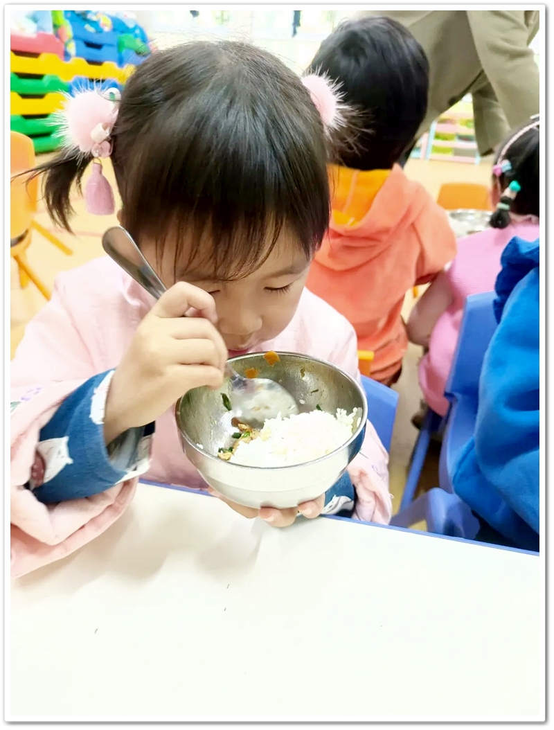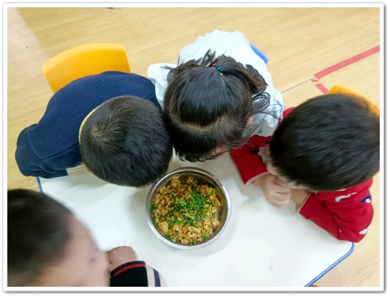 我们将收获的大蒜洗干净,交给厨房的阿姨做了一道“蒜花鸡蛋”。阿姨送来的时候,蒜香四溢,孩子们都馋得不行。大家你分一点,我分一点,不单是鸡蛋,就连大蒜也吃了个精光。平时非常挑食的孩子都把饭菜吃光了。嗯,自己的劳动果实就是好吃!