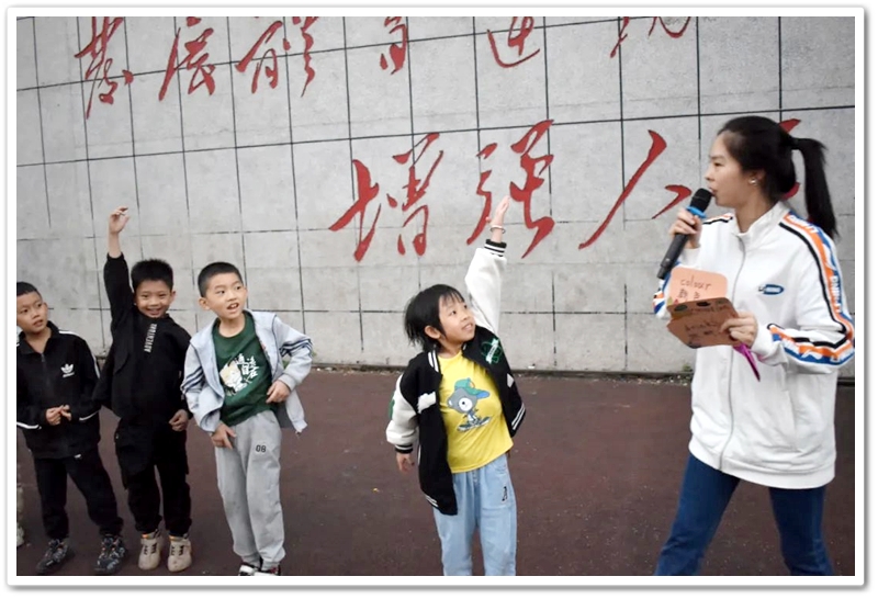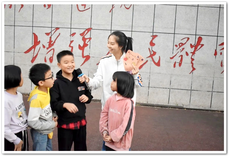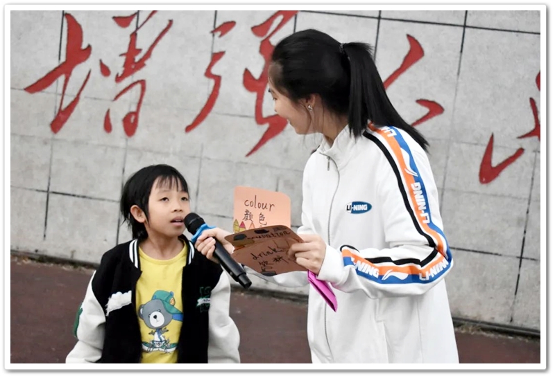 紧接着进入了英语活动环节,孩子们根据类别说单词。Colour(颜色)、animals(动物)、ball game(球类)、 fruits(水果)等类别的单词轮番上阵,参赛选手们努力地在记忆中搜寻平日英语课堂上学过的单词,每想到一个就赶紧举手,表示颜色的”blue、green、red”,表示动物的”duck dog 、bear 、panda 、monkey”,表示球类的“basketball football”,表示水果的“apple、 banana 、pear”,都一一被他们说了出来。选手们用实力向大家展示了英语课堂上的学习成果,引得低年级的孩子投去了羡慕的目光,激发了他们的英语学习兴趣。