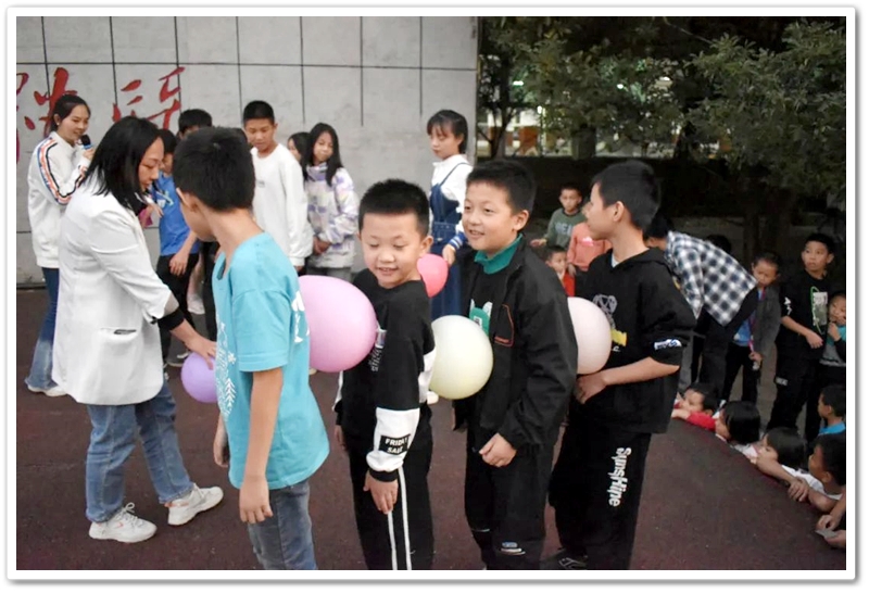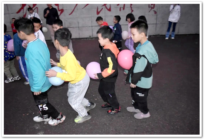 最让孩子们快乐的环节莫过于“夹气球”了。每组四个同学排成一排,两人之间放置一个气球,选手们要分别用前胸和后背夹紧气球往前走,先到终点的一组获得奖品。现场观众早已迫不及待,一个个高举双手,跃跃欲试,胡老师每轮选取了12名同学分为三组比赛,台上的选手小心翼翼地夹着气球朝前走,台下观众的加油助威声此起彼伏,一浪高过一浪,把现场的气氛推上了高潮。