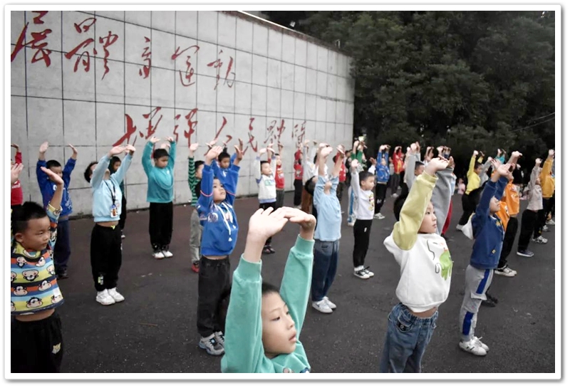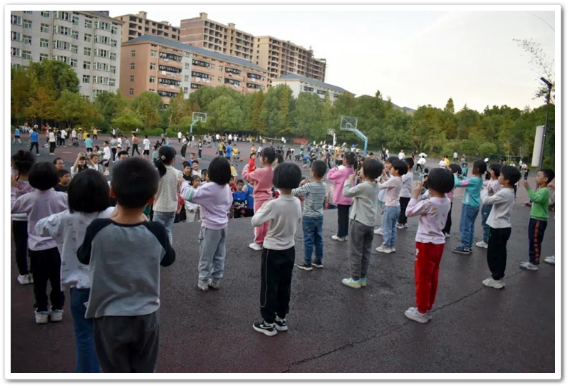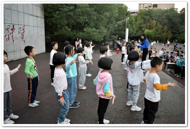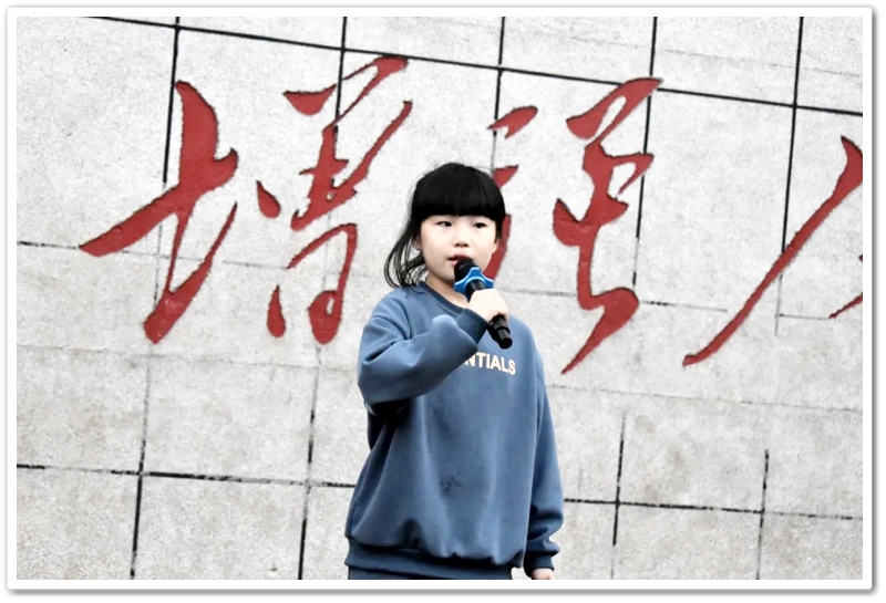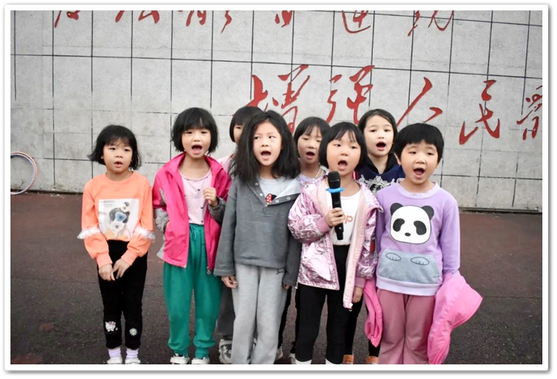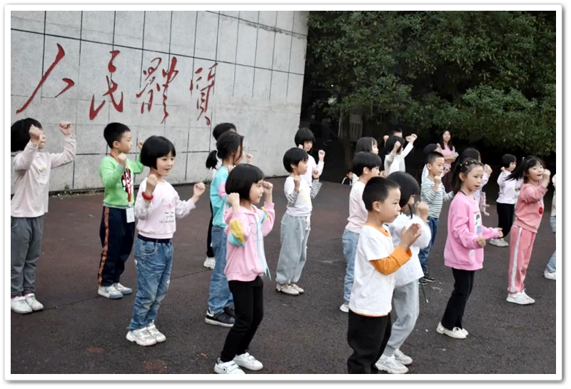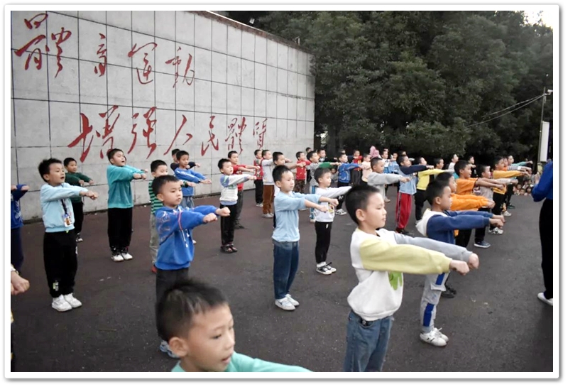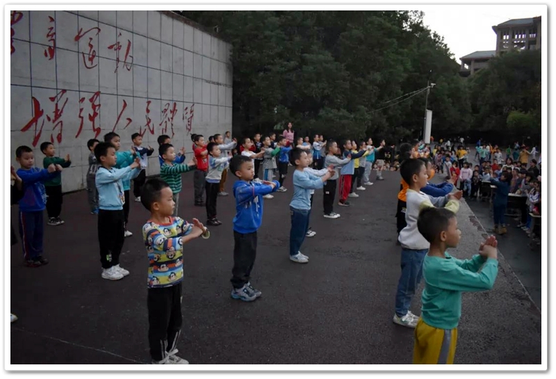 欣赏完美妙的歌声后,随着一首气势磅礴的背景乐响起,一年级武术班的孩子们在李运梅老师的哨声中,有模有样地向大家展示着一个月以来他们训练的成果。一个哨声一个动作,左手出拳,右手出掌,他们的气势很好的诠释了“少年强则国强”的真意。