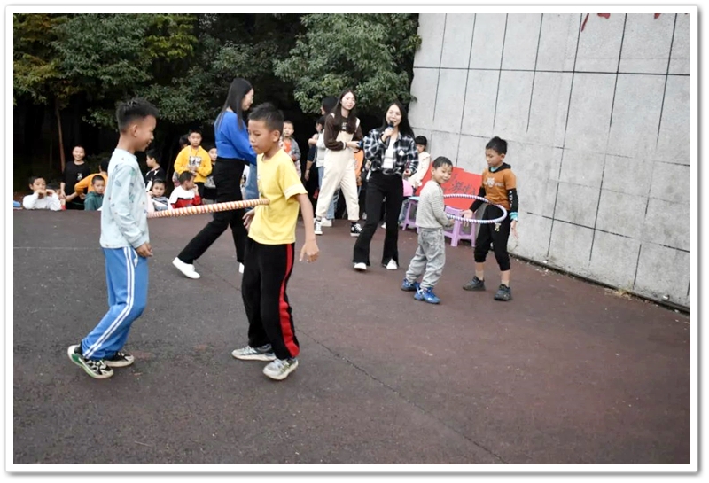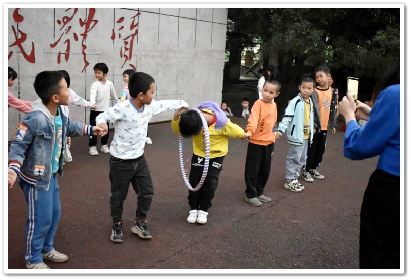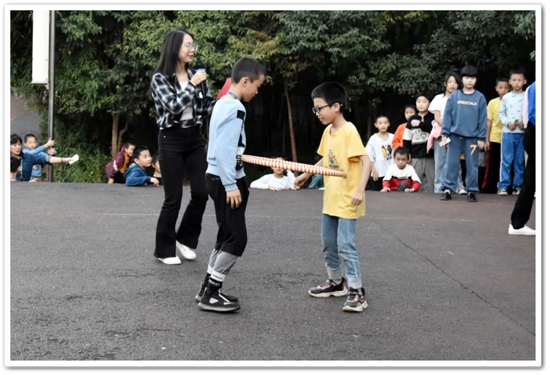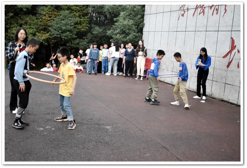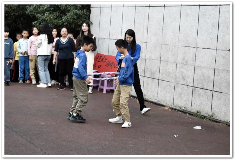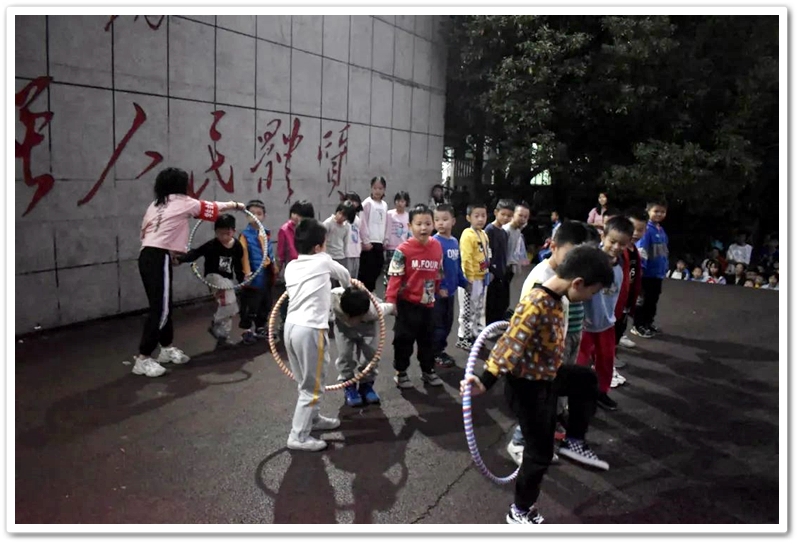 才艺表演告一段落,随之而来的是“一圈到底”游戏环节。还是老规矩,在主持人宣讲完游戏规则后,老师先示范了如何才能快速地将呼啦圈绕过身体传给下一位同学。选手们灵活的身姿让观众看得目不转睛。在观众一声声的加油助威中,参赛选手们大展身手,以各种各样千奇百怪的姿势完成了挑战。