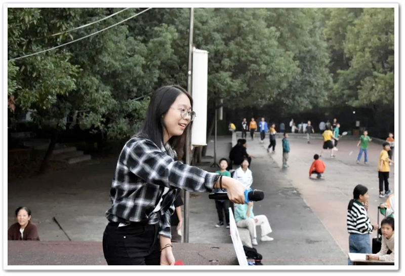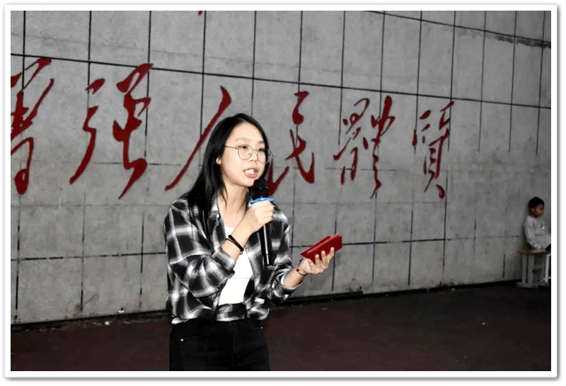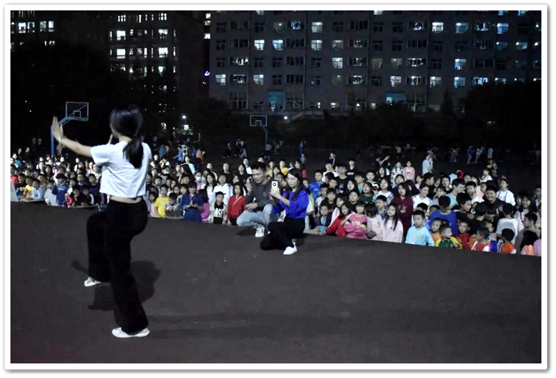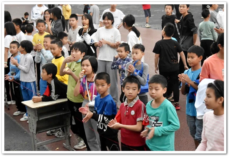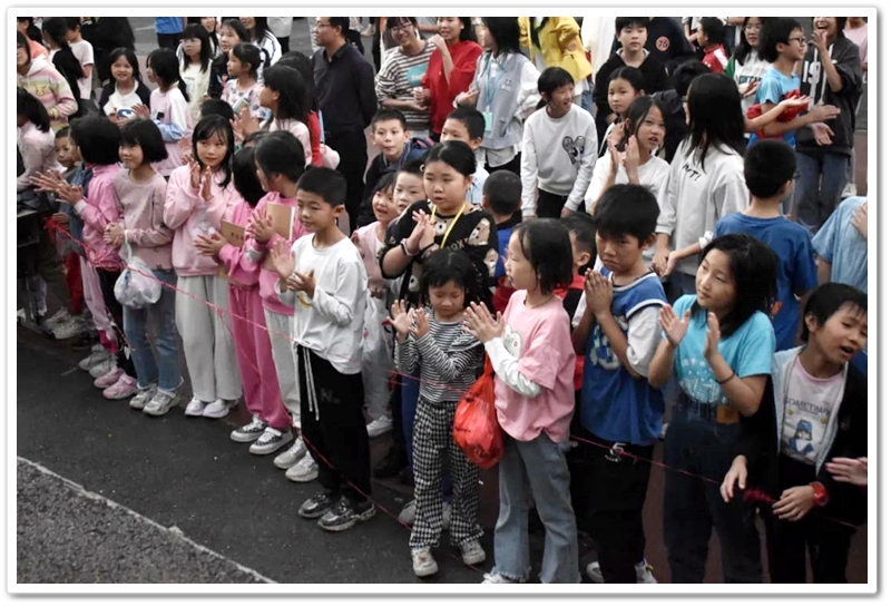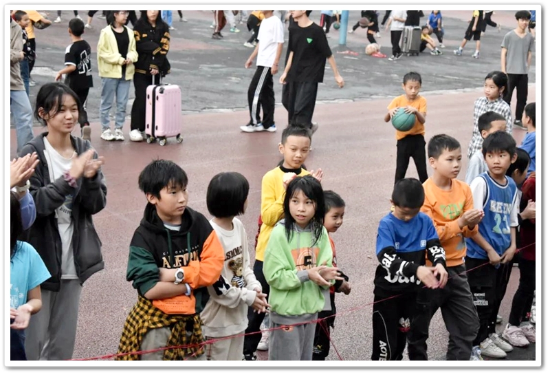 一年级小朋友们认真的小表情,配上国学经典《三字经》的背景音乐,吸引了许多在运动场自由活动的同学。随着时间的推移,排队上台表演的队伍越来越长,舞台周围的粉丝们越来越多。